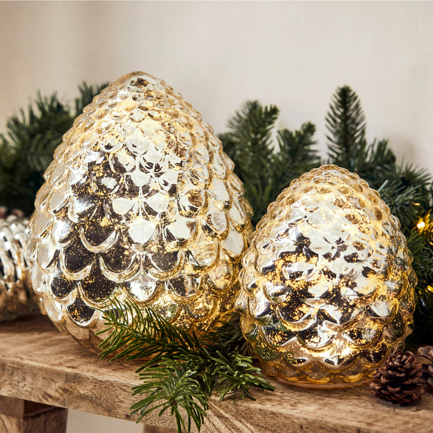 Wie kleine Schätze aus dem Winterwald – diese beiden stilisierten Zapfen sind eine wundervolle Dekoration für die kalten Tage. Sie bestehen aus feinem Glas mit Bauernsilber-Finish und machen sich sehr gut zum Shabby-Chic. Sie erhalten hier zwei Größen im Set. Das Besondere ist, dass die Schmuckstücke von innen mit kleinen LEDs erleuchtet werden können. Durch den Betrieb mit Batterien sind keine störenden Kabel nötig, und Sie sind absolut frei in der Platzwahl. Ob neben dem Bett, im Bad, zum Kekse backen in der Küche, oder am Fenster – erleben Sie eine sehr heimelige Lichtquelle mit viel Charme. An- wie auch ausgeschaltet sind die eleganten Zapfen ein toller Anblick, wodurch sie gleich eine doppelt gute Wahl sind. Hieran haben Sie den ganzen Winter über Freude.