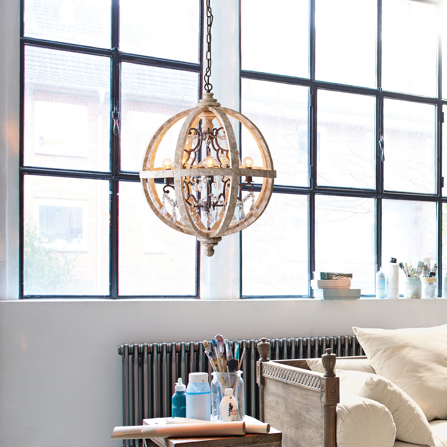 In einem verführerischen Material- und Stilmix umgibt sich diese faszinierende Hängelampe: Von außen in rustikaler Schönheit und aus Holz gestaltet, von innen im Stil eines klassischen Lüsters aus Eisen mit zahlreichen Glasprismen bestückt. Da werden Ihre Gäste staunen und bestimmt zweimal hinschauen, wenn die Hängelampe in Ihrem Ambiente für den großen Auftritt sorgt. Der sechsarmige Lüster aus Eisen funkelt von innen heraus. Dafür sorgen die fein geschliffenen Glasprismen und -ketten. Das äußere Ringgestell ist aus natürlichem Eukalyptusholz und bildet zu den Elementen aus Klarglas einen hübschen Kontrast. Der innere Eisenlüster ist wunderbar verschnörkelt. Für den Country- und Shabby Chic ist die beeindruckende Hängelampe ein Hingucker und bringt zudem ein rustikales Flair in Ihre Wohnräume. Dazu ist stilecht der Holzrahmen mit einem antikbraunen Finish veredelt worden.
