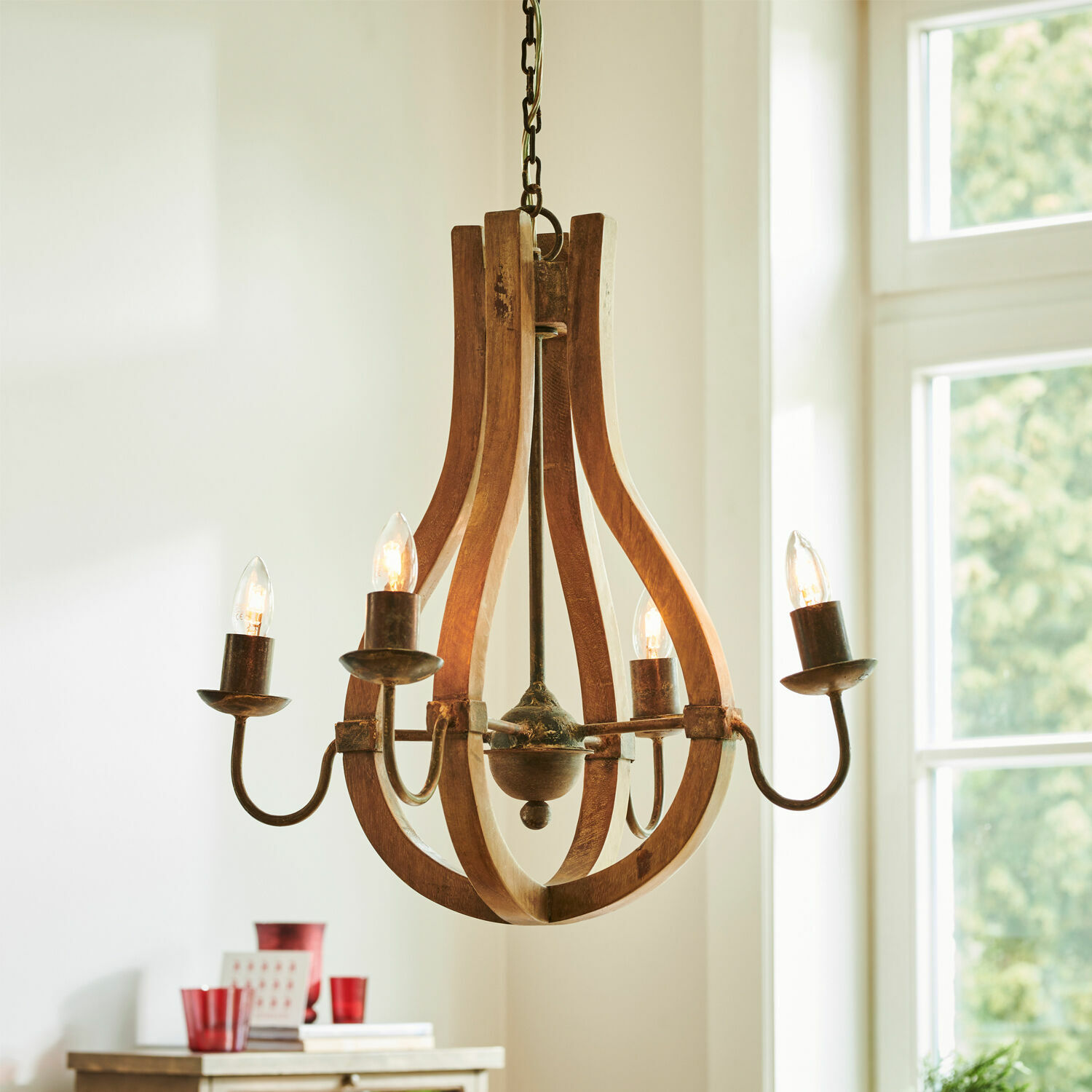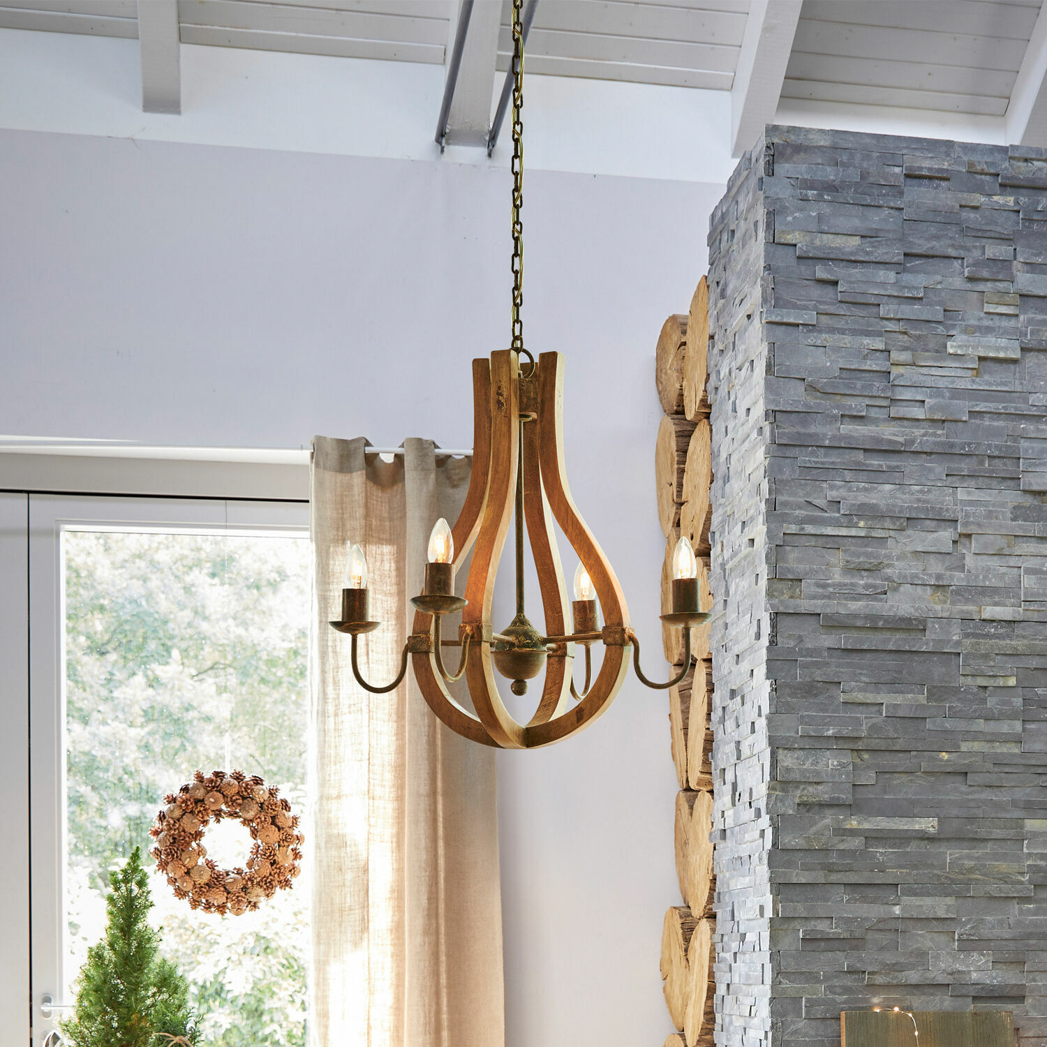 Nach einem traumhaften Winterspaziergang nähern Sie sich mit den letzten stapfenden Schritten Ihrem Urlaubsdomizil, einem historischen Landsitz. Sie streifen im Vorraum die Stiefel ab, nehmen die Wollmütze vom Kopf und öffnen die Tür. Ihr erster Griff geht zum Lichtschalter und sogleich werden Sie von dem herrlich warmen Licht umgeben, das der große Leuchter in der Mitte des Raumes verströmt. Mit seiner eindrucksvollen Gestaltung erzielt er eine enorme optische Wirkung und fesselt den Blick mit seiner Größe, den sanft geschwungenen Streben aus naturbelassenem Mangoholz und den Armen aus Eisen. Eine kontrastreiche Materialkombination, die ein rustikal gemütliches Flair verbreitet. Dazu trägt auch die typische Eisenkette bei, mit der er stilecht an der Decke befestigt wird. Aber natürlich braucht der Leuchter kein nobles Anwesen auf dem Land, um seine stilvolle Ausstrahlung zu entfalten. Er zaubert das urige Land-Flair auch in ein Haus am Stadtrand oder ins Appartement in der City. Ob er nun bald in Ihrem Wohnzimmer, über der Essecke oder im Eingangsbereich für angenehme Lichtstimmung sorgen darf – der Leuchter wird in jedem Raum die Blicke auf sich ziehen.
