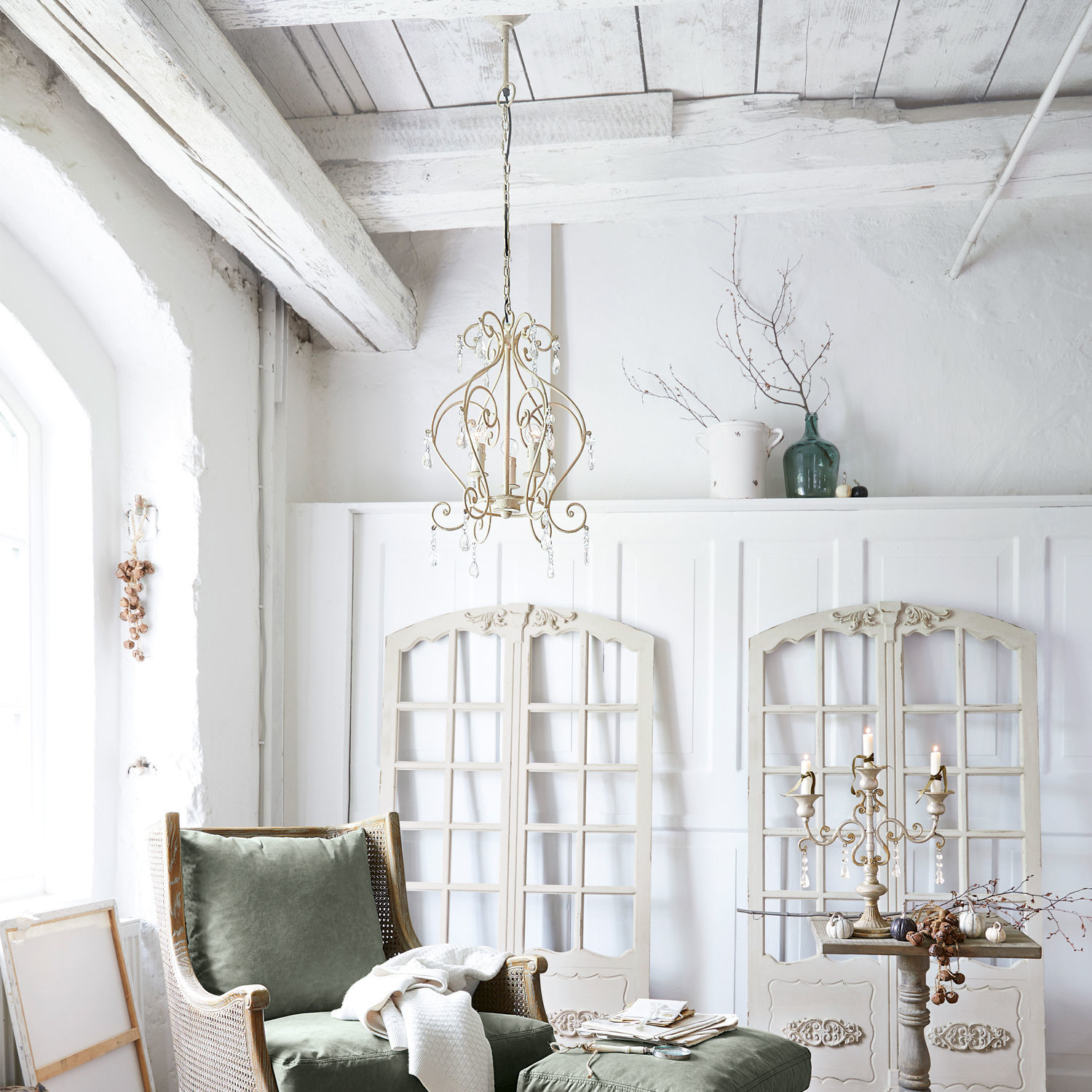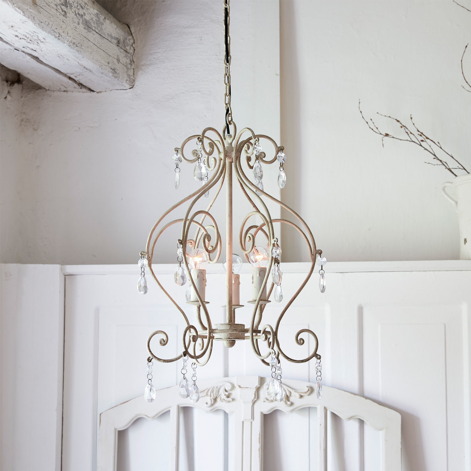 Ein wertvolles Highlight mit beinahe royalem Flair. Der wunderschöne, luxuriöse Leuchter bezaubert mit seinem romantisch geschwungenen Gestell aus Eisen. Dieses zieren funkelnde Glas-Prismen – ein reizendes Extra. Das kunstvolle Design wird mit drei Glühbirnen erleuchtet, sodass Sie eine ausgesucht schöne Lichtstimmung erleben. An den Lampenfassungen befinden sich kleine Tropfenförmchen, die herabfließendes Wachs hübsch nachahmen. Als komme dieser Leuchter aus geraumer Vorzeit und wurde damals, wie üblich, mit Kerzen betrieben. Ein hübsches kleines Detail. Zudem ist das elegante Kunstwerk eine wahre optische Zierde, ob an- oder ausgeschaltet. Es passt hervorragend zum Shabby-Chic und lässt das Herz aller Romantiker höher schlagen. Eine gekonnte Wahl für Wohn- oder Schlafzimmer, an der Sie lange Freude haben werden. Luxus pur mit zartem Charme – ein absolutes Lieblingsstück.