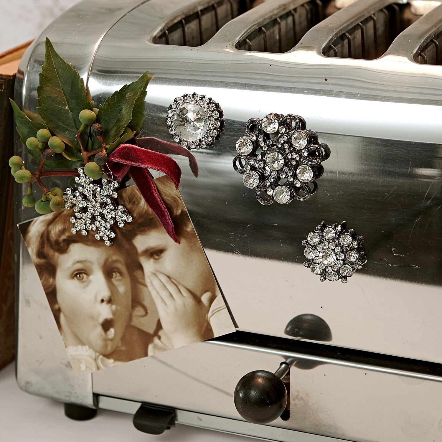 Die Magnete in Antiksilber kommen zu Ihnen in vier unterschiedlichen Designs und Größen – der Durchmesser variiert dabei jeweils zwischen 3 und 5 Zentimetern. Für den edlen Look der kunstvollen Deko-Objekte wurden in Handarbeit klassisch geschliffene Glassteine auf das filigrane, silberfarbene Eisengerüst gesetzt. Schön als dekorativer Akzent am Memoboard oder dem Kühlschrank – aber auch für allerlei kreative Deko-Ideen geeignet.