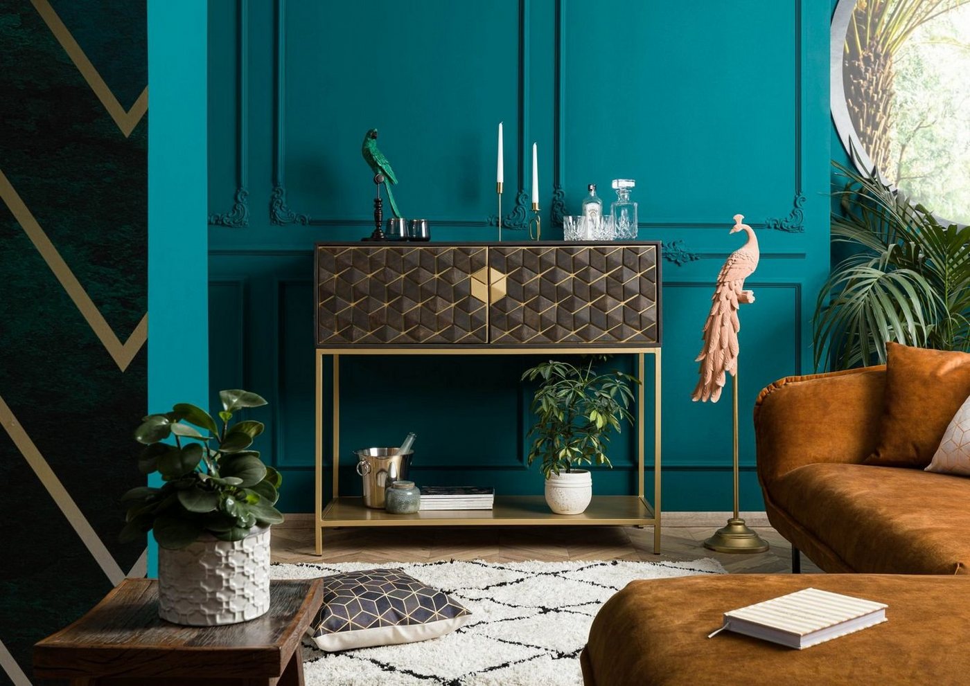 Bar Mango 122x50x110 grau geölt DIAMOND #113Produkt: Bar (modern) Serie: DIAMOND Breite: 122 cm Tiefe: 50 cm Höhe: 110 cm Gewicht: 50 kg Holzart: Mango, vollmassiv Material: Massivholz Farbe: grau geölt Versand erfolgt frei Bordsteinkante.Dieser Barschrank zeigt sich vom Stil des Art déco inspiriert: Die filigranen Gold-Details, das Relief-Muster und das golden schimmernde Eisengestell verleihen dem Möbel ein ausdrucksstarkes Äußeres. Hinter den Türen mit den dekorativen Fronten verbirgt sich eine Glashalterung: Kopfüber lassen sich hier rund 20 Gläser stilvoll verstauen. Platz für Flaschen oder Zubehör findet sich auf dem Metallzwischenboden, der toll ins Gesamtbild der Bar passt.