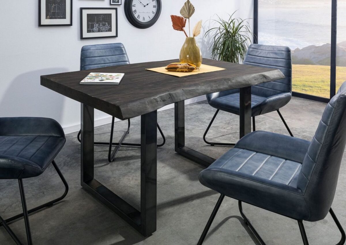 Baumtisch Mango 160x90x77 grau lackiert / U-Beine anthrazit glänzend FREEFORM 5Produkt: Esstisch (Modern) Serie: FREEFORM Breite: 160 cm Tiefe: 90 cm Höhe: 77 cm Gewicht: 53 kg Holzart: Mango, vollmassiv Material: Massivholz Farbe: grau acrylbeschichtet Versand erfolgt frei Bordsteinkante.Dieser Esstisch ist die perfekte Symbiose aus Natur und Design: Die massive Tischplatte aus Mango mit echter Baumkante vereint sich mit einem stabilen Kufengestell aus Eisen. Mit der Lackierung in edlem Grau bleibt die individuelle Maserung des Holzes erhalten – und ist dabei sicher geschützt vor äußeren Einflüssen. Ein robustes Unikat, das alle Blicke auf sich zieht!