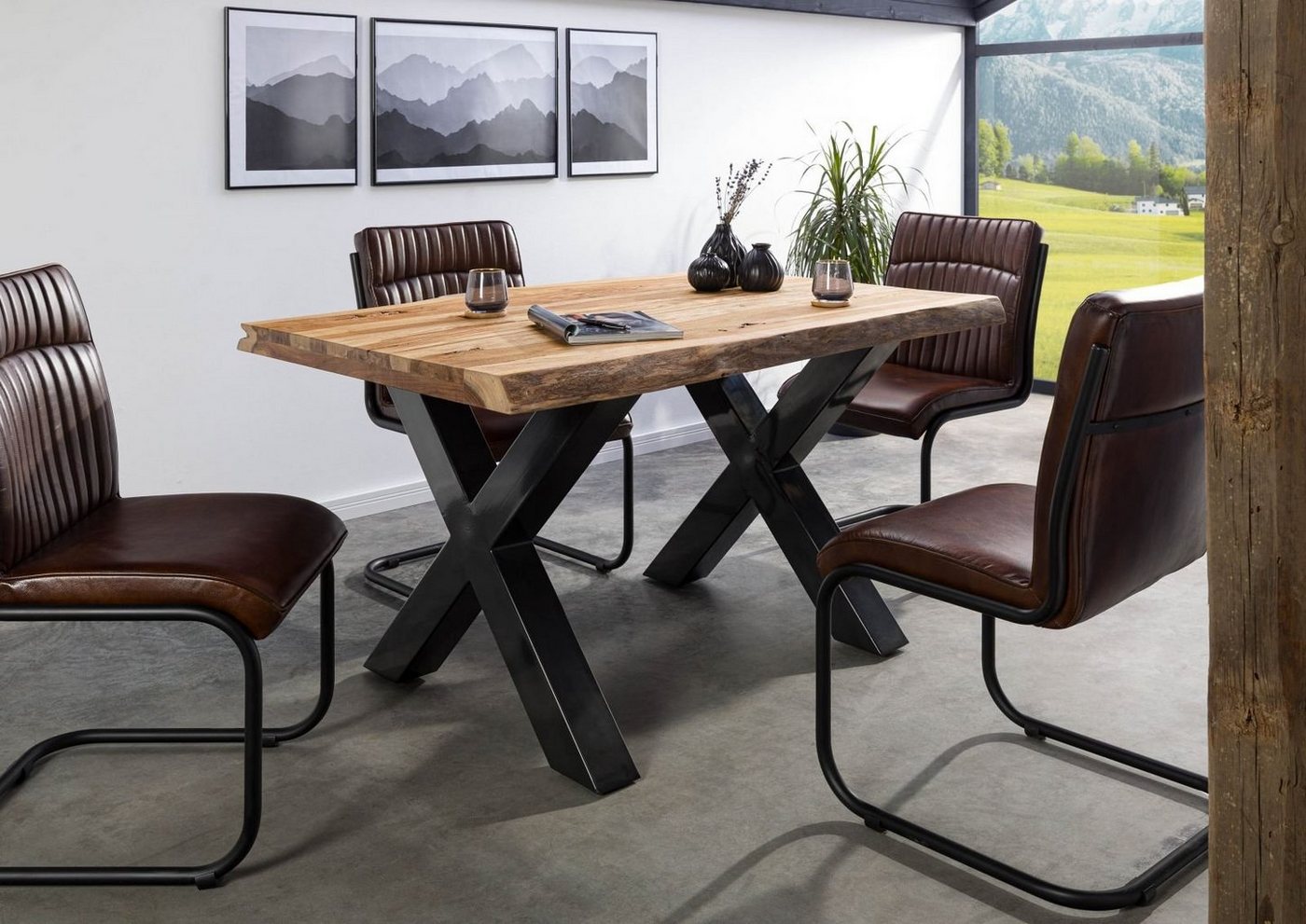 Baumtisch Sheesham 160x90x77 natur sandgestrahlt / X-Beine anthrazit glänzend FREEFORM 5Produkt: Esstisch (Modern) Serie: FREEFORM Breite: 160 cm Tiefe: 90 cm Höhe: 77 cm Gewicht: 75 kg Holzart: Sheesham, vollmassiv Material: Massivholz Farbe: Mango natur sandgestrahlt Das Produkt wird zerlegt geliefert. Versand erfolgt frei Bordsteinkante. Baumkantentisch natur aus Sheesham, 160 cmBlickfang: geschwungene, sandgestrahlte Tischplatte X-Beine aus Metall verkörpern Industrial Stylebei Massivmoebel24 weitere Baumkantentische der Serie FREEFORM 5 entdecken!Dieser Baumkantentisch ist einfach einzigartig: Seine geschwungene Tischplatte aus dem Edelholz Sheesham verleiht ihm das besondere Etwas. Die Form wird dabei durch die natürliche Baumkante bestimmt. Das sandgestrahlte Finish betont gekonnt die Holzstruktur und mutet rustikal und natürlich an. In Kombination mit den soliden X-Beinen aus glänzendem, anthrazitfarbenem Metall bringt dieser massive Tisch den Industrial Style in jedes Esszimmer. Weitere Baumtische in verschiedenen Farben und Größen sowie mit unterschiedlichen Tischbeinen finden Sie in unserem Sortiment.