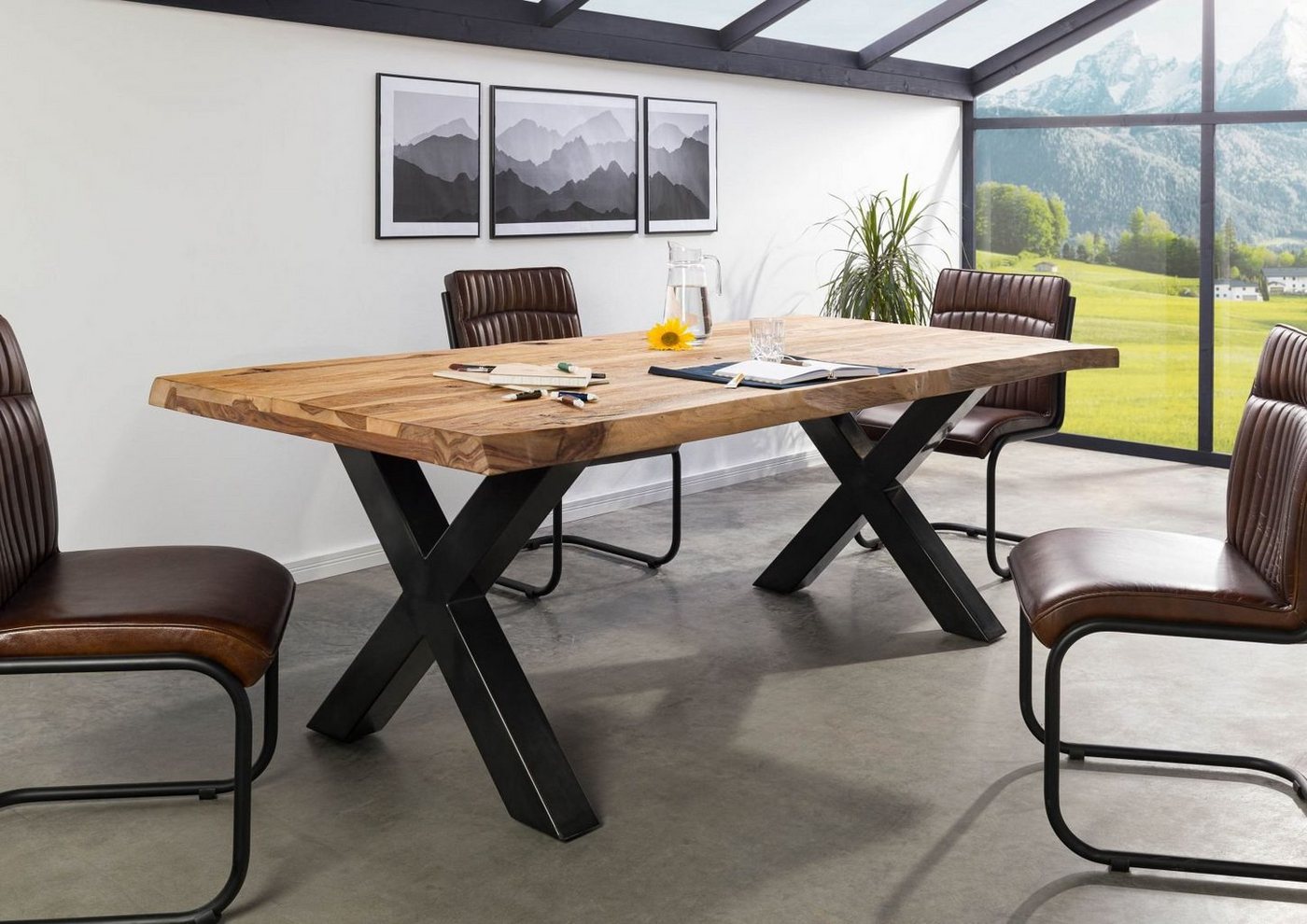 Baumtisch Sheesham 180x90x77 natur sandgestrahlt / X-Beine anthrazit glänzend FREEFORM 5Produkt: Esstisch (Modern) Serie: FREEFORM Breite: 180 cm Tiefe: 90 cm Höhe: 77 cm Gewicht: 82 kg Holzart: Sheesham, vollmassiv Material: Massivholz Farbe: Mango natur sandgestrahlt Das Produkt wird zerlegt geliefert. Versand erfolgt frei Bordsteinkante. Baumkantentisch natur aus Sheesham, 180 cmBlickfang: geschwungene, sandgestrahlte Tischplatte X-Beine aus Metall verkörpern Industrial Stylebei Massivmoebel24 weitere Baumkantentische der Serie FREEFORM 5 entdecken!Dieser Baumkantentisch ist einfach einzigartig: Seine geschwungene Tischplatte aus dem Edelholz Sheesham verleiht ihm das besondere Etwas. Die Form wird dabei durch die natürliche Baumkante bestimmt. Das sandgestrahlte Finish betont gekonnt die Holzstruktur und mutet rustikal und natürlich an. In Kombination mit den soliden X-Beinen aus glänzendem, anthrazitfarbenem Metall bringt dieser massive Tisch den Industrial Style in jedes Esszimmer. Weitere Baumtische in verschiedenen Farben und Größen sowie mit unterschiedlichen Tischbeinen finden Sie in unserem Sortiment.