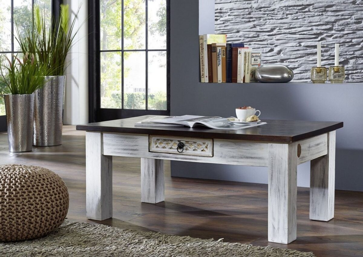 Couchtisch Mango / Akazie 110x60x45 weiß gewachst CASTLE-ANTIK #245 —Produkt: Couchtisch Serie: CASTLE-ANTIK Breite: 110 cm Tiefe: 60 cm Höhe: 45 cm Gewicht: 33 kg Holzart: Mango / Akazie, vollmassiv Material: Massivholz Farbe: weiß / braun gewachst Versand erfolgt frei Bordsteinkante.Massiver Couchtisch aus Vollholz: Romantisches Statement Robust und romantisch zugleich wirkt dieser massive Couchtisch der Möbelserie CASTLE ANTIK. Gefertigt aus vollmassivem Mango- und Akazienholz setzt das Möbelstück Akzente mit seinem geradlinigen Design: Bewusst massiv gestaltete Beine und die dunkle Tischplatte aus Akazie ziehen die Blicke des Betrachters auf sich. Für romantische Momente sorgt das Finish der weißen Teile im angesagten Shabby-Stil. Durch die Auftragetechnik scheint das Mangoholz stellenweise unter dem Finish hervor. Unter der Tischplatte des versteckt sich ein kleines Extra: Eine Schublade aus lackierter Akazie dient zum Verstauen von kleinen Schätzen und Co. Die Front des Schubfachs besteht wiederum aus gewachster Mango, die hier zusätzlich mit einer dekorativen Fräsung verziert wurde. Der Schubladengriff aus dunklem Metall rundet das verspielte Design dieses Wohnzimmertisches ab.