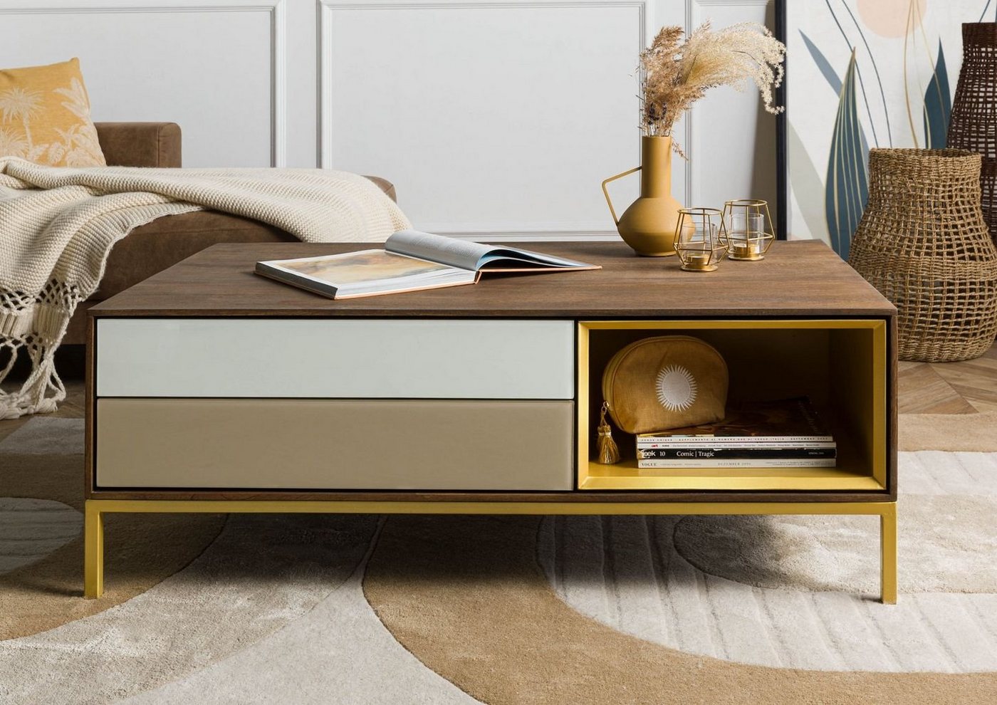 Couchtisch Mango 112x67x43 braun geölt CHICAGO #112Produkt: Couchtisch (Modern) Serie: CHICAGO Breite: 112 cm Tiefe: 67 cm Höhe: 43 cm Gewicht: 51 kg Holzart: Mango, teilmassiv Material: Massivholz Farbe: braun geölt Das Produkt wird montiert geliefert. Versand erfolgt frei Bordsteinkante. Benötigen Sie weitere Versandinformationen, können Sie uns gerne telefonisch erreichen! moderner Couchtisch in Dunkelbraun2 Schubladen mit Glasfronten in Beigetönen und 1 offenes Fachaufregende Kombination aus massivem Mangoholz-Korpus, minimalistischen Stahlbeinen und edlen Glasfrontenmetallische Einfassung in Goldgelb macht den Tisch zum Hinguckerharmoniert mit weiteren Designermöbeln der Serie CHICAGODieser Couchtisch im modernen Look überzeugt durch seinen Material-Mix. Das rechteckige Grundgestell aus goldgelben Eisen und einem dunkelbraunem Mangoholz-Korpus bietet zwei Schubladen mit beigefarbenen Glasfronten sowie ein offenes Fach. Dabei kommt der Tisch dank Push-to-Open Technik ohne Griffe aus, was die cleane Formsprache unterstreicht. Ein ästhetisches Design, welches durch seinen ausgefallen Look jedes Wohnambiente optisch aufwertet.
