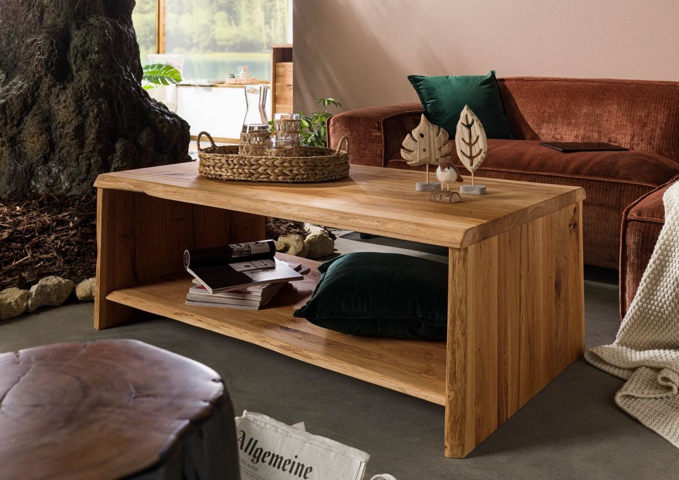 Couchtisch Wildeiche 120x45x70 natur geölt PURE OAK #308Produkt: Couchtisch (modern) Serie: PURE OAK Breite: 120 cm Tiefe: 45 cm Höhe: 70 cm Gewicht: 58 kg Holzart: Wildeiche, vollmassiv Material: Massivholz Farbe: Eiche natur geölt Versand erfolgt frei Bordsteinkante.Dieser Eiche Baumkante Couchtisch der PURE OAK Serie verbindet klares Design mit einem aufregenden Rohstoff. Denn das verwendete Material ist massives Eichenholz. Die geölte Oberfläche des Wohnzimmertischs gibt die ausdrucksstarke Maserung und individuelle Struktur der Wildeiche preis – und zeigt, dass ein simples Design voll und ganz überzeugt. Doch der Massivholztisch aus Eiche hat auch eine praktische Seite: eine Zwischenebene sorgt für praktische Ablagefläche.