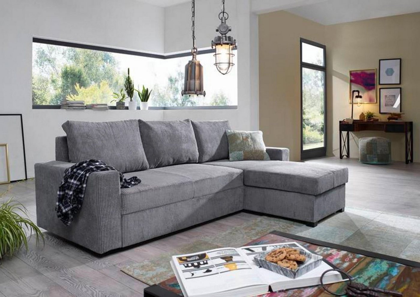 Ecksofa 238x164x87 grau Cordstoff MERKLINProdukt: Sofa (Vintage) Serie: SOFAS Breite: 238 cm Tiefe: 164 cm Höhe: 87 cm Gewicht: 110 kg Holzart: , Material: 100% Polyester Farbe: grau Versand erfolgt frei Bordsteinkante.- Ottomane links und rechts montierbar- mit SchlafffunktionMaße:Höhe ca. 87cmBreite ca. 238cmTiefe: ca. 93cmTiefe Ottomane: ca. 164cm Sitzhöhe: ca. 42cmSitztiefe mit Kissen: ca. 55cmPolsterung: hochwertiger Formschaum auf WellenfederungGestell: HolzFüße: Kunsstoff schwarzMaterial Bezug: 100% PolyesterLieferung ohne Dekokissen und DeckeDer individuelle Charme dieser Couchgarnitur überzeugt einfach! Die Eckcouch MERKLIN ist ein wunderschönes Polstermöbel mit einer Oberfläche aus Cord. Dieses effektvolle Material ist nicht nur besonders zeitgenössisch, sondern auch extrem robust. Lassen Sie sich auch von dem exzellenten Sitzkomfort begeistern, der mit dieser Eckgarnitur Einzug in Ihr Heim halten wird!
