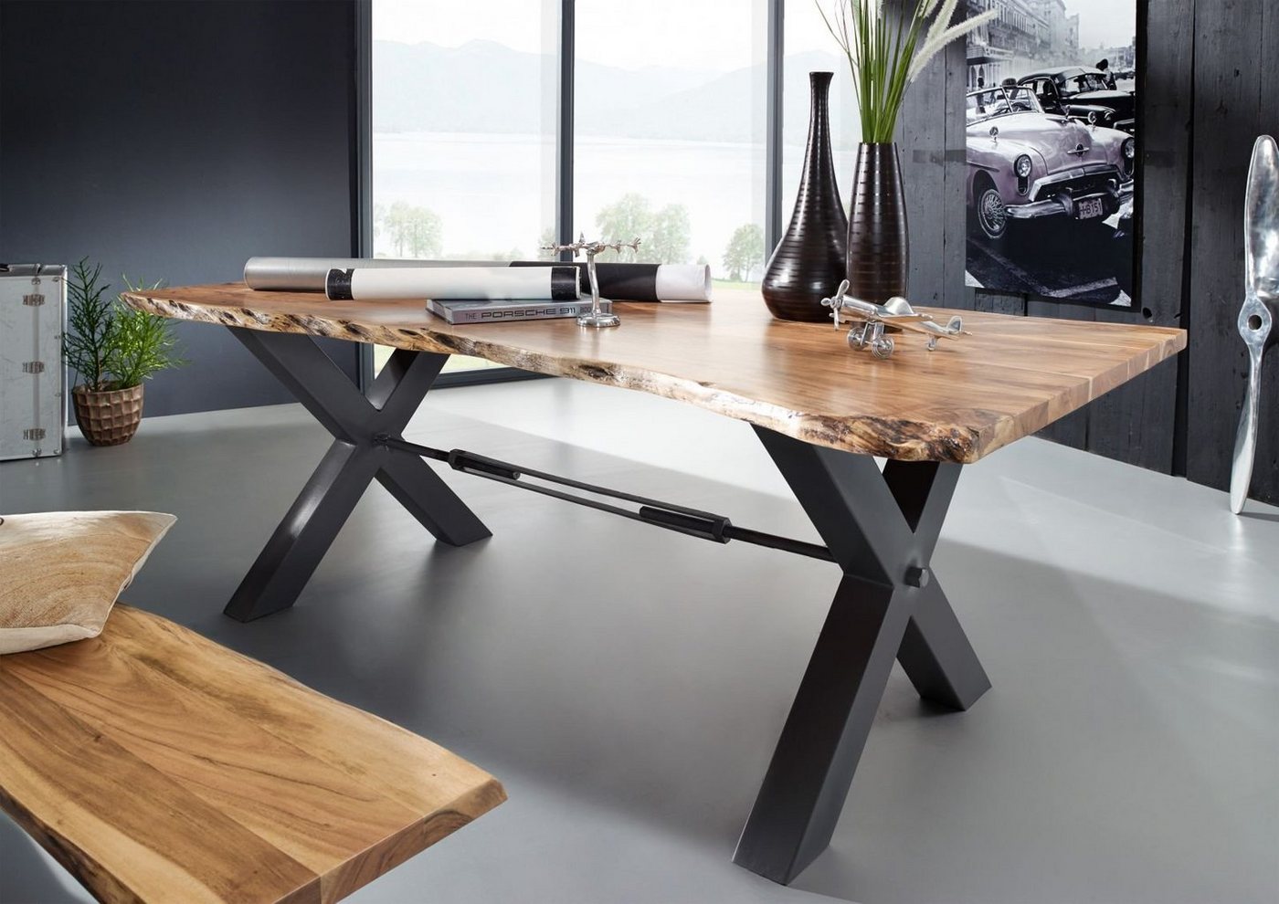 Esstisch Akazie 220x100x76 natur lackiert IRON LABEL #127Produkt: Esstisch (Modern) Serie: IRON LABEL Breite: 220 cm Tiefe: 100 cm Höhe: 76 cm Gewicht: 104 kg Holzart: Akazie, vollmassiv Material: Metall Farbe: Akazie natur lackiert Versand erfolgt frei Bordsteinkante.- Tischplattenstärke: 3,5cm- Tischplatte: natur lackiert- X-Beine: dunkel anthrazit Ein außergewöhnlicher Tisch mit einem exzellenten Design, das ist der IRON LABEL Esstisch. Der ansprechende Esszimmertisch begeistert mit einer Tischplatte im Design Baumkante. Ein stilechter Kontrast zum natürlichen Look der Platte ist das x-förmige Gestell aus Metall. Gerade dieses gekonnte Zusammenspiel macht das Möbelstück aus Akazie zu einem echten Hingucker, der auch in Ihrem Esszimmer seine Schönheit entfalten wird!