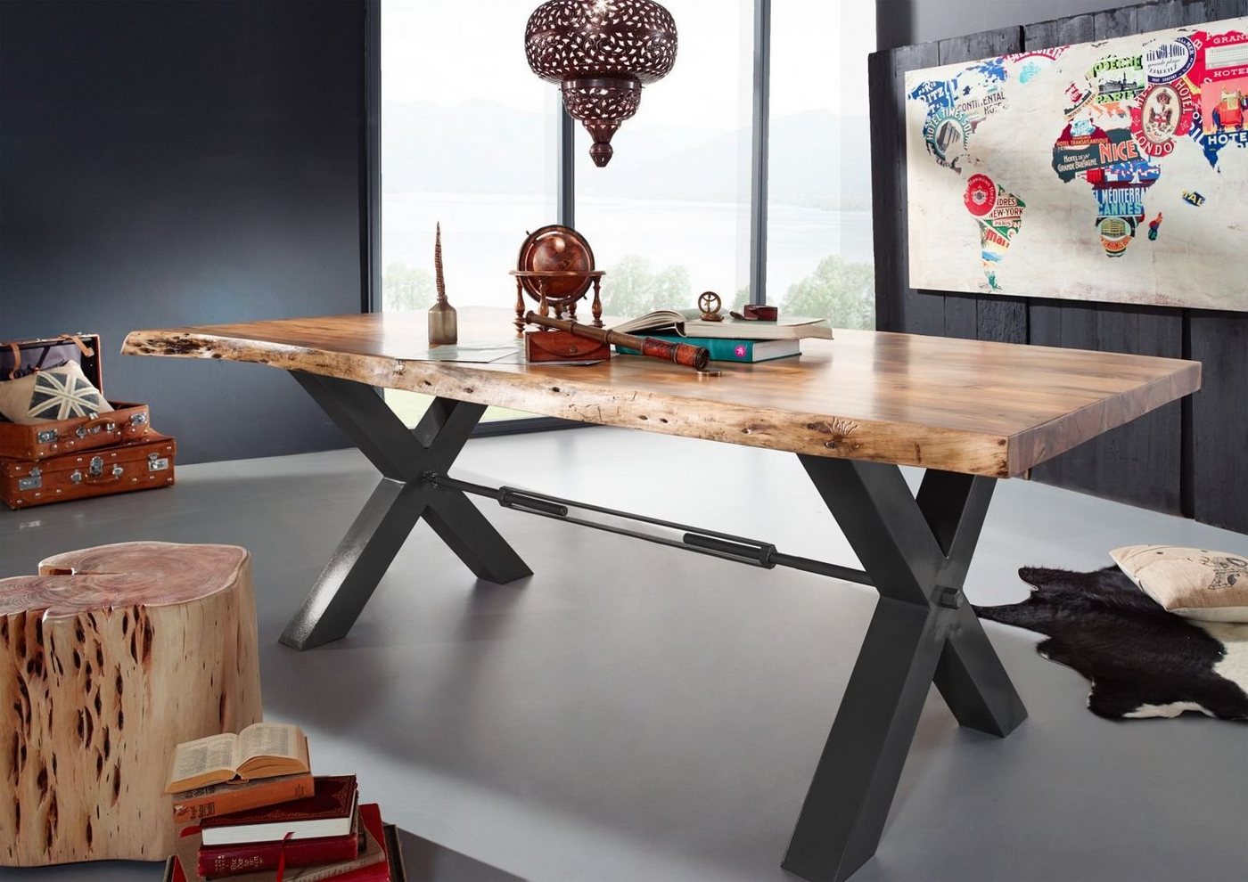 Esstisch Akazie 240x110x76 natur lackiert IRON LABEL #188Produkt: Esstisch (Modern) Serie: IRON LABEL Breite: 240 cm Tiefe: 110 cm Höhe: 76 cm Gewicht: 157 kg Holzart: Akazie, vollmassiv Material: Metall Farbe: Akazie natur lackiert Versand erfolgt frei Bordsteinkante.- Tischplattenstärke: 5,5cm- Tischplatte: natur lackiert- X-Beine: dunkel anthrazitEin außergewöhnlicher Tisch mit einem exzellenten Design, das ist der IRON LABEL Esstisch. Der ansprechende Esszimmertisch begeistert mit einer Tischplatte im Design Baumkante. Ein stilechter Kontrast zum natürlichen Look der Platte ist das x-förmige Gestell aus Metall. Gerade dieses gekonnte Zusammenspiel macht das Möbelstück aus Akazie zu einem echten Hingucker, der auch in Ihrem Esszimmer seine Schönheit entfalten wird!