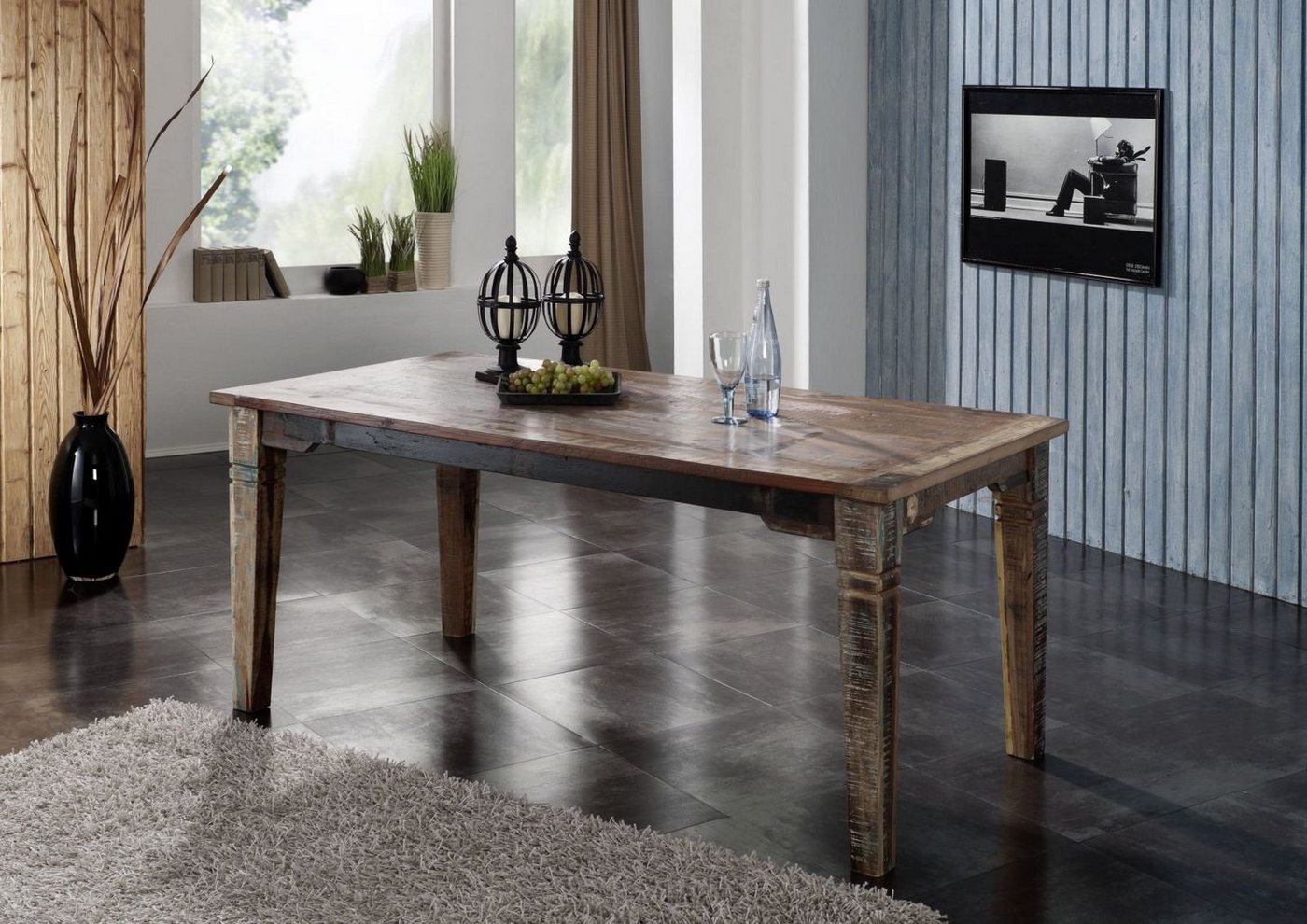 Esstisch Altholz 180x90x76 mehrfarbig lackiert NATURE OF SPIRIT #31Produkt: Esstisch (Vintage) Serie: NATURE OF SPIRIT Breite: 180 cm Tiefe: 90 cm Höhe: 76 cm Gewicht: 45 kg Holzart: Altholz, vollmassiv Material: Massivholz Farbe: mehrfarbig lackiert Versand erfolgt frei Bordsteinkante.Besonderheit: – ca. 60% wiederverwertetes Altholz- Rest, neues massives Mango- oder AkazienholzBeeindruckender Altholz Esstisch im Vintage Stil aus der Serie NATURE OF SPIRIT. Wärme und Behaglichkeit bieten sich beim Anblick dieses kunstvoll gefertigten Esstisches dar und laden ein, um beim gemütlichenBeisammensein dieses Ambiente zu genießen. Aus indischem Altholz hergestellt das aus Teilen alter Schiffe und Brücken gewonnen wird.Spuren des originalen Gebrauchs betonen den Vintage ? Stil auf imposante Weise und sind deshalb absichtlich belassen.Alle Teile dieses Esstisches wurden in vollmassiver Fertigung hergestellt und bietet die nötige Robustheit und Stabilität welche solch ein Möbelstück besitzen muss
