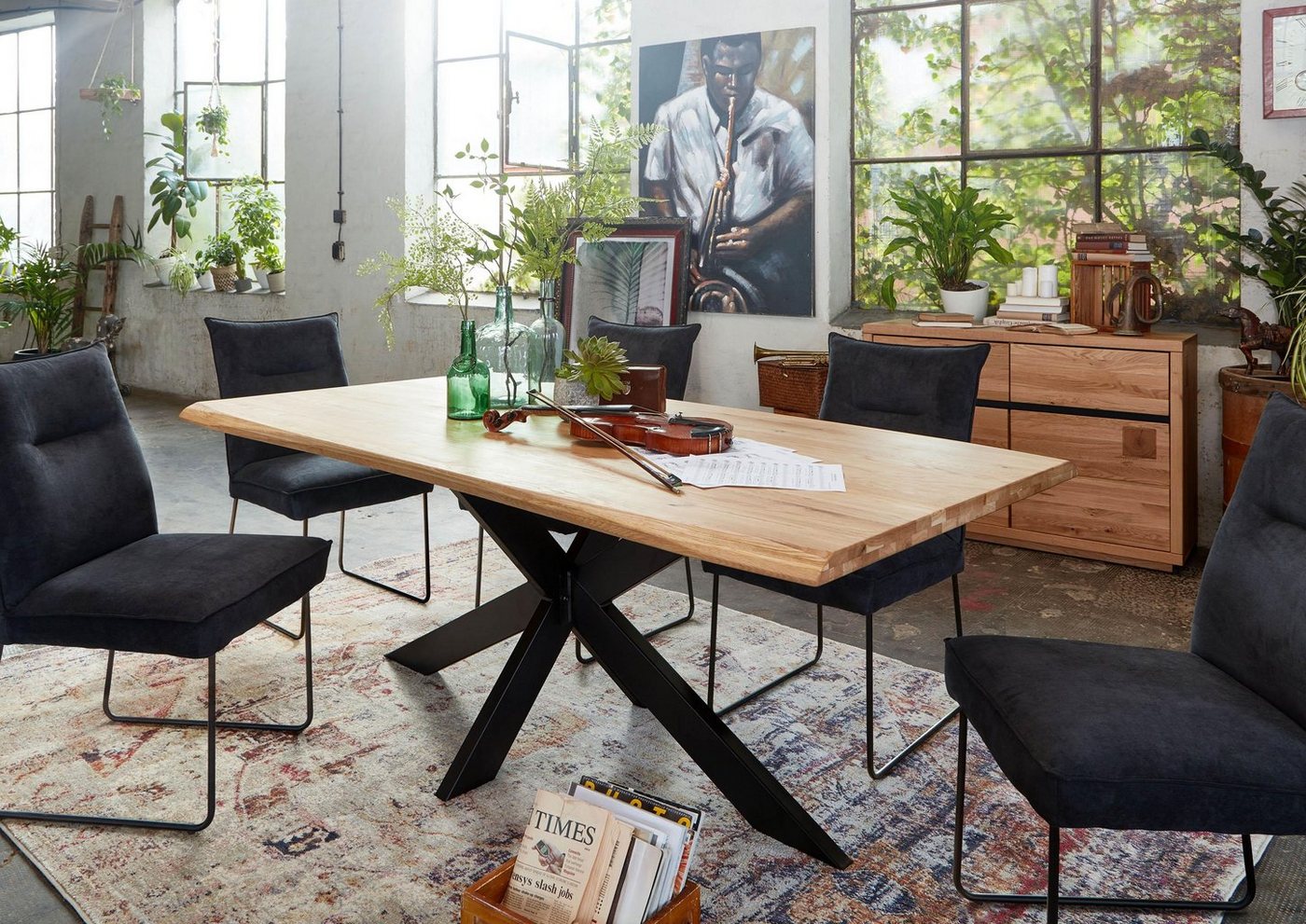 SEATTLE Esstisch #01 200×100 Kreuzgestell Wildeiche braunProdukt: Esstisch Serie: SEATTLE Breite: 200 cm Tiefe: 100 cm Höhe: 77 cm Gewicht: 59 kg Holzart: Wildeiche, vollmassiv Material: Massivholz Farbe: Braun geölt Das Produkt wird zerlegt geliefert.Dieser Esstisch aus Wildeiche bringt Leben in den Alltag! Die Tischplatte aus massiver Wildeiche betont bewusst Astlöcher und kleine Unebenheiten für einen unverwechselbaren Look. Die optische Illusion der gedrehten Tischkante gibt diesem Esszimmertisch einen überraschenden Twist. Und das raffinierte Kreuzgestell, auch Spider Legs genannt, aus hochwertigem Metall sorgt nicht nur für eine stylische Optik, sondern schafft auch beachtliche Beinfreiheit – sogar an den Stirnseiten. Ein echter Eyecatcher für jedes Interieur.