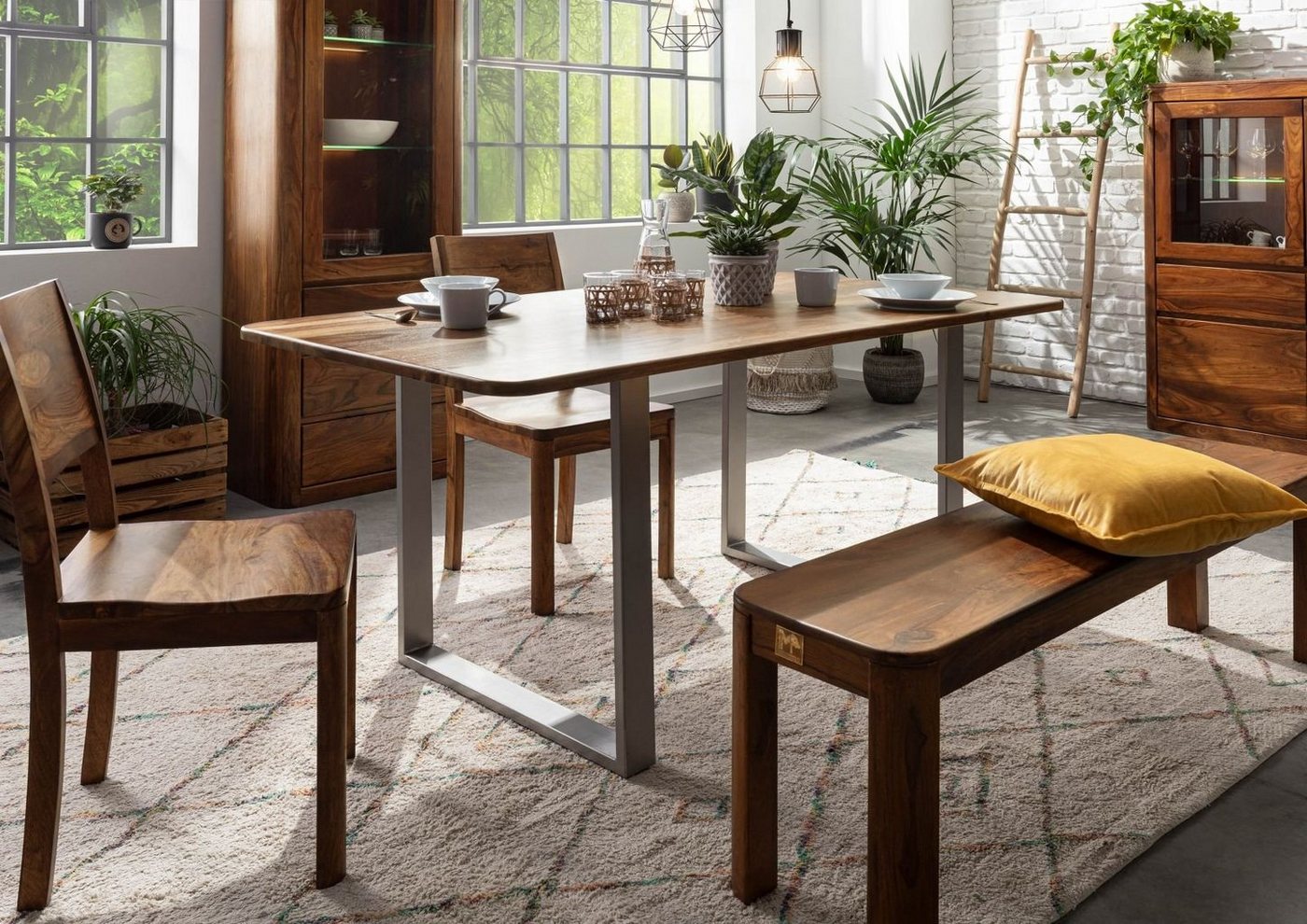 Esstisch Sheesham 200x100x76 walnuss lackiert TORONTO #235Produkt: Esstisch (Modern) Serie: TORONTO Breite: 200 cm Tiefe: 100 cm Höhe: 76 cm Gewicht: 75 kg Holzart: Sheesham / Akazie, vollmassiv Material: Massivholz Farbe: walnuss lackiert Versand erfolgt frei Bordsteinkante.Dieser Tisch ist ein außergewöhnliches Naturholzmöbel aus unserer TORONTO Serie. Er weist einerseits mit seinen abgerundeten Ecken und der Farbe in walnuss die typischen Merkmale der Möbellinie auf und fällt durch seine ungewöhnliche Materialkombination auf der anderen Seite aus dem Rahmen. Die Tischfläche ist aus dem massiven Holz des Palisanders gearbeitet, das noch seine natürliche Maserung beibehalten hat. Das Holz ist aufgrund seiner hohen Dichte besonders gut für die Möbelherstellung geeignet. Fällt mal ein Glas um, sind die Spuren anschließend schnell beseitigt, ohne sich im Material zu verewigen. Die Tischbeine sind im absoluten Kontrast dazu aus Metall gearbeitet.