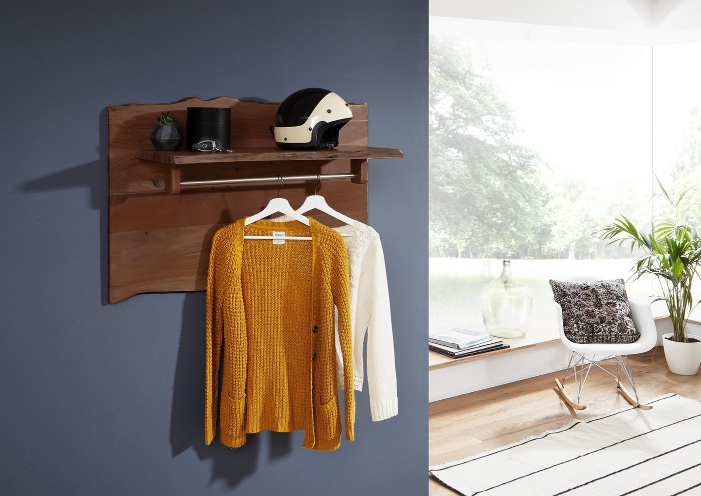 Garderobe Akazie 100x32x60 braun lackiert PURE ACACIA #815Produkt: Garderobe (Modern) Serie: PURE ACACIA Breite: 100 cm Tiefe: 32 cm Höhe: 60 cm Gewicht: 18 kg Holzart: Akazie, vollmassiv Material: Massivholz Farbe: braun lackiert Das Produkt wird zerlegt geliefert.Setzen Sie mit dieser Wandgarderobe der Wohnserie PURE ACACIA auch im Flur auf Natur. Das eindrucksvolle Möbelstück besteht aus vollmassiver Akazie. Deren lebendige Maserung überzieht das großzügige Wandelement und fängt so den Blick des Betrachters ein. Die Hauptrolle in der Gestaltung der Wandgarderobe aus Massivholz spielen aber die Ränder, deren Form dem natürlichen Wuchs des Baumes folgt. Die naturgegebenen Unebenheiten verleihen dem Design einen ganz ursprünglichen Charakter. Praktisch: Das Regalbrett, das der Aufhängung der Garderobenstange dient, ist zugleich Ablagefläche für Geldbeutel, Schlüssel und Co.