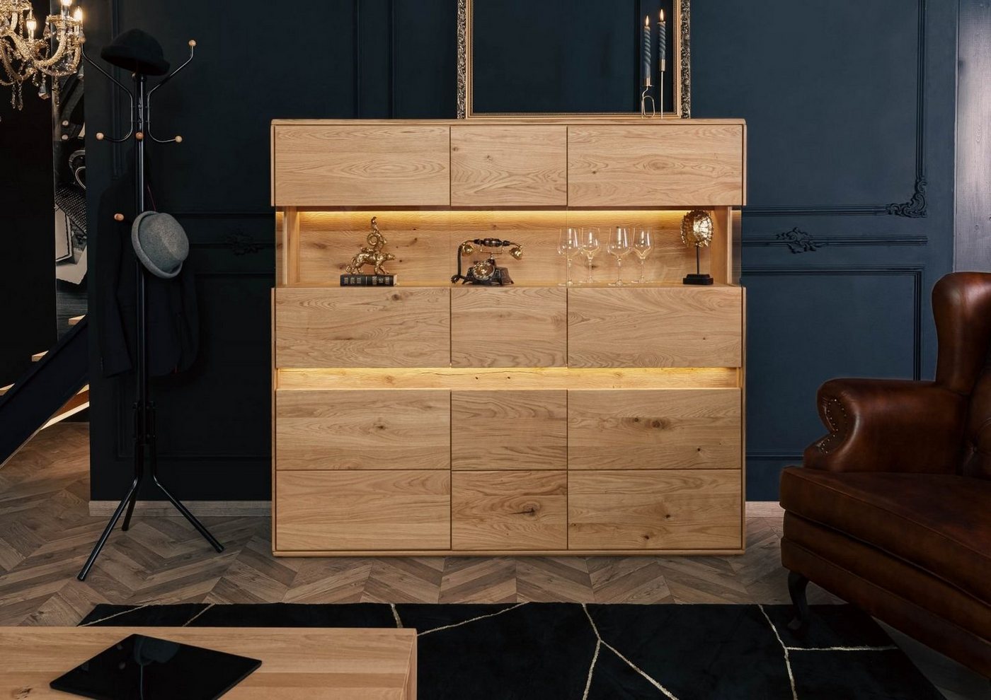 Highboard Wildeiche inkl. LED 163×43,5×152 natur geölt CARDIFF #122Produkt: Highboard (Modern) Serie: CARDIFF Breite: 163 cm Tiefe: 43,5 cm Höhe: 152 cm Gewicht: 133 kg Holzart: Wildeiche, vollmassiv Material: Massivholz Farbe: Eiche natur geölt Das Produkt wird montiert geliefert. Versand erfolgt frei Bordsteinkante. Benötigen Sie weitere Versandinformationen, können Sie uns gerne telefonisch erreichen! breites Highboard aus Eiche in massiver Qualitätextra viel Stauraum: 13 Fächer hinter 6 Massivholz Türen mit GlaseinsatzTüren schließen dank Soft-Close-Technologie besonders sanftelegantes Tafel-Design – ganz ohne GriffeLED-Leisten setzen Akzente und betonen die auffällige Maserung der Wildeichehier weitere Highboards aus der Serie CARDIFF entdeckenDieses grifflose Highboard aus Eiche in massiver Qualität ist nicht nur ein wahres Stauraumwunder, sondern auch ein stylischer Hingucker: Die sechs Türen schließen dank der Soft-Close-Technologie besonders sanft. Im Inneren bieten ganze 13 Fächer mit teilweise verstellbaren Einlegeböden jede Menge Platz. Besondere Gegenstände präsentieren sich außerdem toll hinter dem Glaseinsatz und sind dabei perfekt vor äußeren Einflüssen geschützt. Der Clou: Die eingebaute LED-Beleuchtung setzt nicht nur Lieblingsstücke perfekt in Szene, sondern betont auch die auffällige Maserung der geölten Wildeiche.