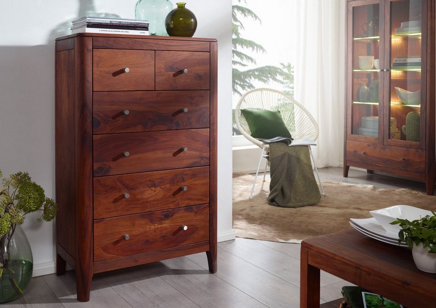Kommode Sheesham 70x40x115 braun geölt BROOKLYN #23Produkt: Kommode (Modern) Serie: BROOKLYN Breite: 70 cm Tiefe: 40 cm Höhe: 115 cm Gewicht: 57 kg Holzart: Sheesham / Palisander, vollmassiv Material: Massivholz Farbe: walnuss geölt Versand erfolgt frei Bordsteinkante.Kommode aus Sheesham: Natürlich edel aufgeräumt Werten Sie Flur oder Wohnzimmer mit dieser eleganten Kommode aus Massivholz der Serie BROOKLYN auf: Gefertigt aus vollmassivem Sheeshamholz, besticht das Schränkchen vor allem durch sein Äußeres. Denn auf den glatten Fronten kann die außergewöhnliche Struktur des Holzes seine Wirkung komplett entfalten. Kunstvoll kombinierte Elemente aus Splintholz und dem dunkleren Kernholz lassen diese Optik umso mehr in den Vordergrund treten. Das moderne Design mit seiner harmonischen Formsprache und dem walnussbraunen Finish unterstreicht den edlen Gesamteindruck der Kommode. Auch das Innere kann sich sehen lassen: Vier Schubladen, welche die ganze Breite der Kommode einnehmen, bieten großzügigen Stauraum für Ihre Schätze und Utensilien. Das oberste Fach teilt sich in zwei schmale Schubfächer, wo vor allem Kleinteiliges gut aufgehoben ist.