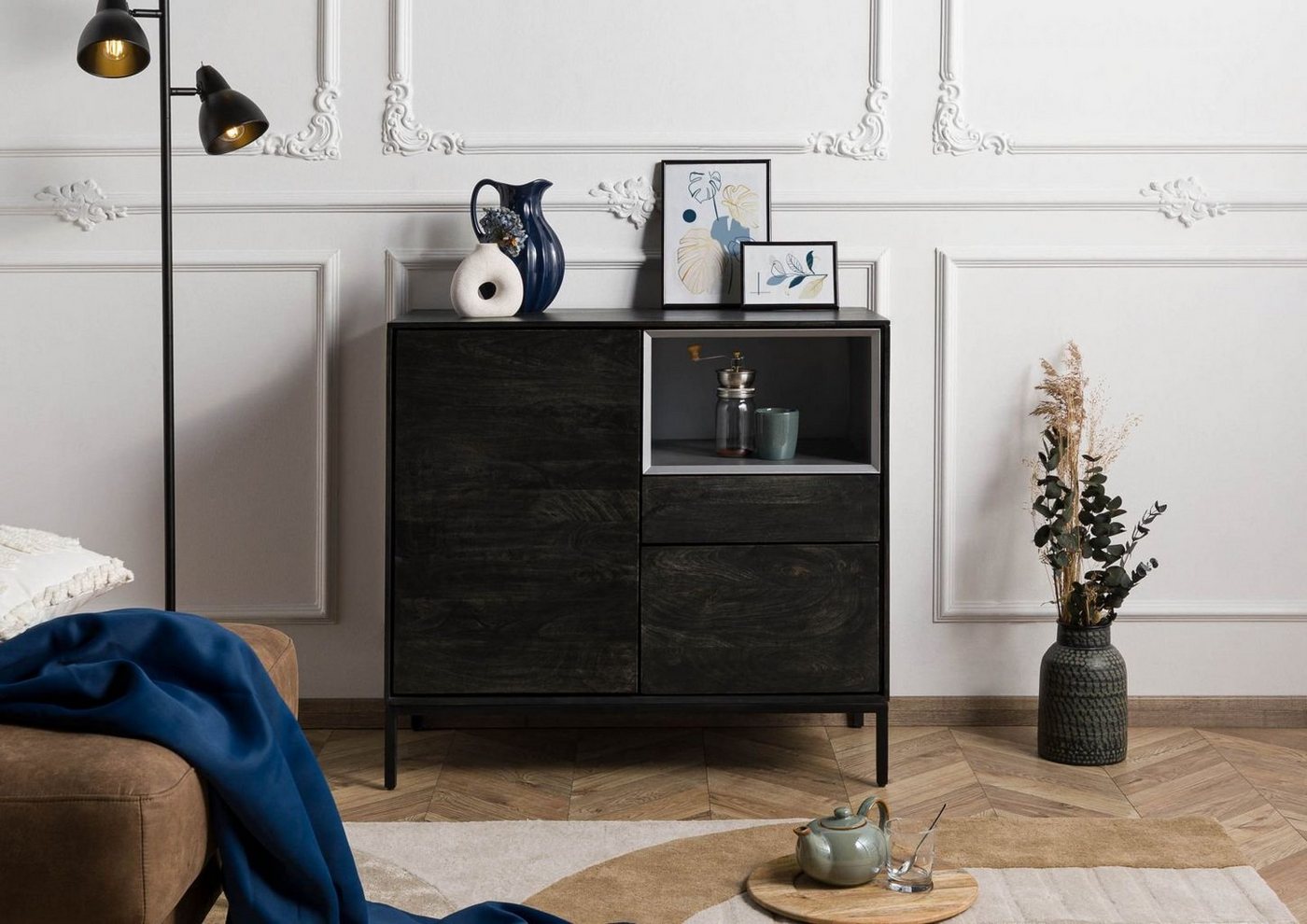 Kommode Mango 90x45x85 dunkelgrau geölt CHICAGO #208Produkt: Kommode (Modern) Serie: CHICAGO Breite: 90 cm Tiefe: 45 cm Höhe: 85 cm Gewicht: 59 kg Holzart: Mango, teilmassiv Material: Massivholz Farbe: dunkelgrau geölt Das Produkt wird montiert geliefert. Versand erfolgt frei Bordsteinkante. Benötigen Sie weitere Versandinformationen, können Sie uns gerne telefonisch erreichen! massive Kommode in modernem Design aus dunkel-geöltem Mangoholz in den Maßen 90x45x85 cmdekorativer Stauraum dank 1 offenen Ablage sowie 1 Schublade und 3 Fächern hinter 2 Holztürendie grifflose Optik stellt die markante Maserung der geölten Mango in den VordergrundDesign trifft Kunst: die helle Lackierung der offenen Ablage rahmt jeden Gegenstand wie ein Gemäldeschlanke Füße aus schwarzem Metall runden die geradlinige Formgebung der Kommode abweitere Möbel der Serie CHICAGO entdecken