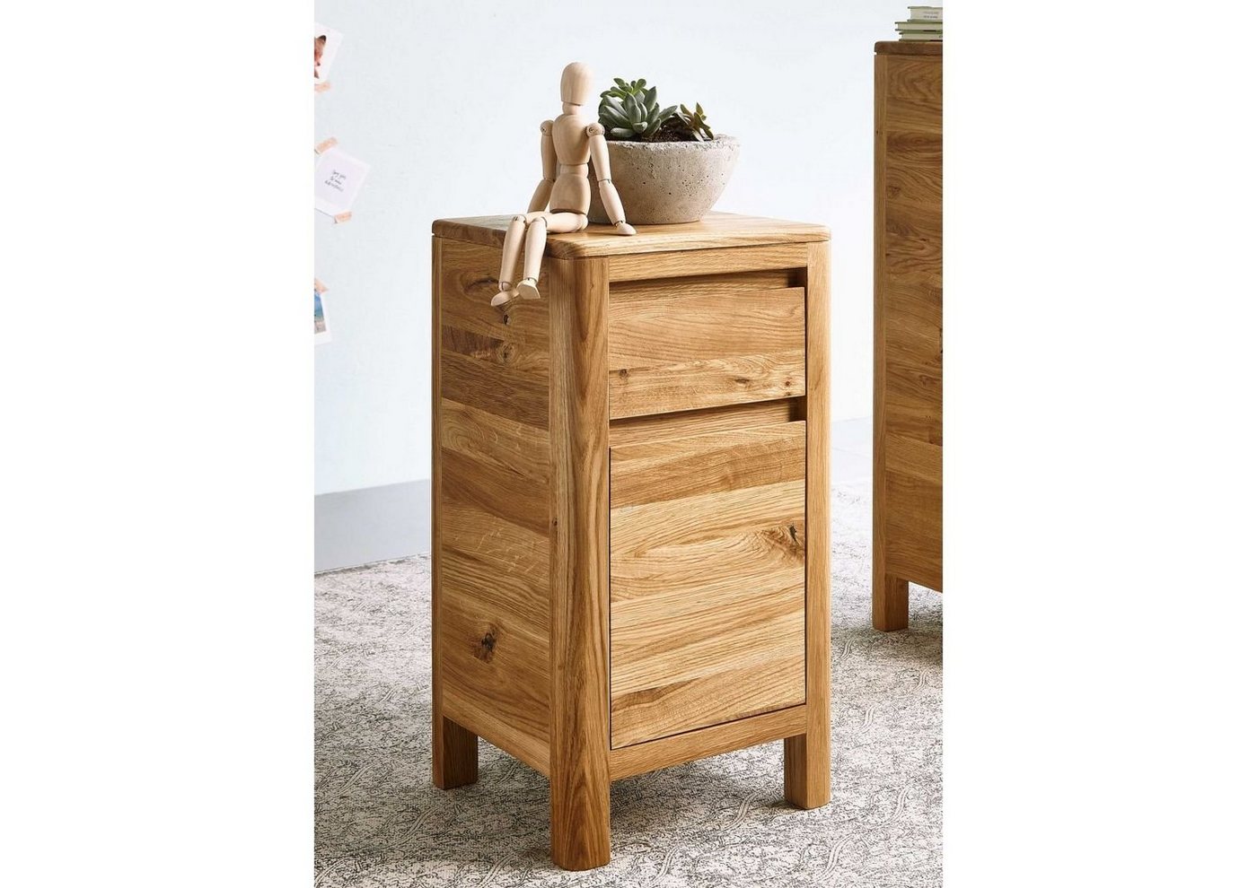 Kommode niedrig Wildeiche 30x30x60 natur geölt LINZ #21Produkt: Kommode (Landhausstil) Serie: LINZ Breite: 30 cm Tiefe: 30 cm Höhe: 60 cm Gewicht: 13 kg Holzart: Wildeiche, vollmassiv Material: Massivholz Farbe: Eiche natur geölt Versand erfolgt frei Bordsteinkante.Kommode niedrig Wildeiche 30x30x60 natur geölt LINZ #21 modernACHTUNG: Es handelt sich hierbei nur um die auf der linken Seite abgebildete Kommode!Besondere Merkmale: – Ecken gerundet- 1 Holztür- 1 SchubladeDer perfekte Einrichtungsgegenstand, der bestehende Arrangements komplettiert oder Dachschrägen und Nischen im wahrsten Sinne des Wortes aufmöbelt: Lassen Sie sich von dieser Massivholz Kommode der Reihe LINZ begeistern. Das Kleinmöbel wurde aus dem soliden Holz der Wildeiche gearbeitet und wartet mit einer nuancenreichen Maserung und sichtbaren Astansätzen auf, die natürlichen Chic verkörpern. Ein weiteres Extra der kleinen Kommode ist zudem die grifflose Optik: So können Schublade und Tür bequem durch die integrierte Griffleiste geöffnet werden. Die abgerundeten Kanten sind eine weitere moderne Besonderheit, die dem Möbelstück das gewisse Etwas verleiht.