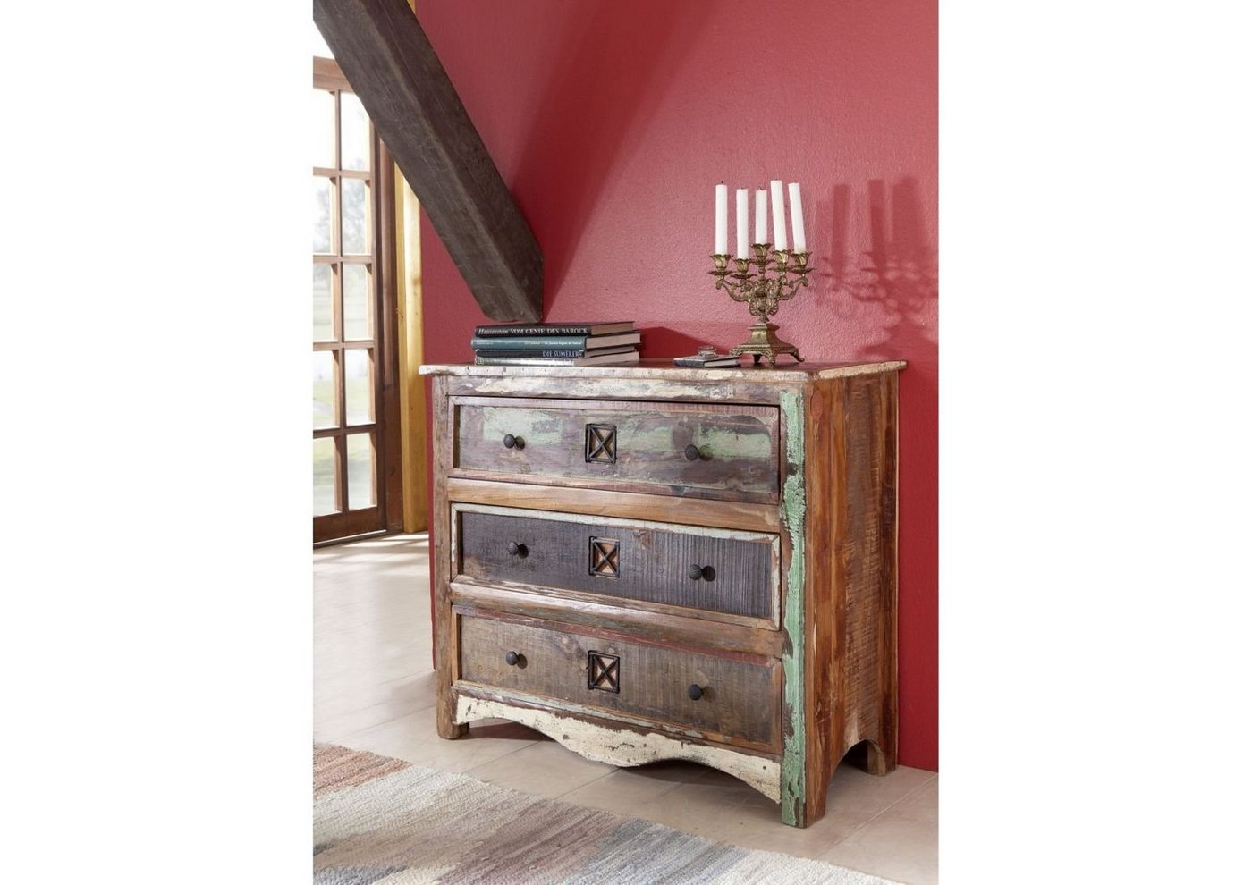 Kommode Altholz 100x42x88 mehrfarbig lackiert NATURE OF SPIRIT #49Produkt: Kommode (Vintage) Serie: NATURE OF SPIRIT Breite: 100 cm Tiefe: 42 cm Höhe: 88 cm Gewicht: 55 kg Holzart: Altholz, vollmassiv Material: Massivholz Farbe: mehrfarbig lackiert Versand erfolgt frei Bordsteinkante.Besonderheit: -ca. 60% wiederverwertetes Altholz -Rest, neues massives Mango- oder Akazienholz Charmante bunte Altholz Kommode im Vintage mit 3 Schubladen aus der Serie NATURE OF SPIRIT. Kaum ein Möbelstück bietet eine derartige Farbgestaltung in welcher sich diese Kommode zeigt. Mit dem verwendeten indischen Altholz, welches aus alten Schiffen und Brücke gewonnen wurde bietet sich neben dem besonderen Design auch eine exklusive Materialwahl dar.