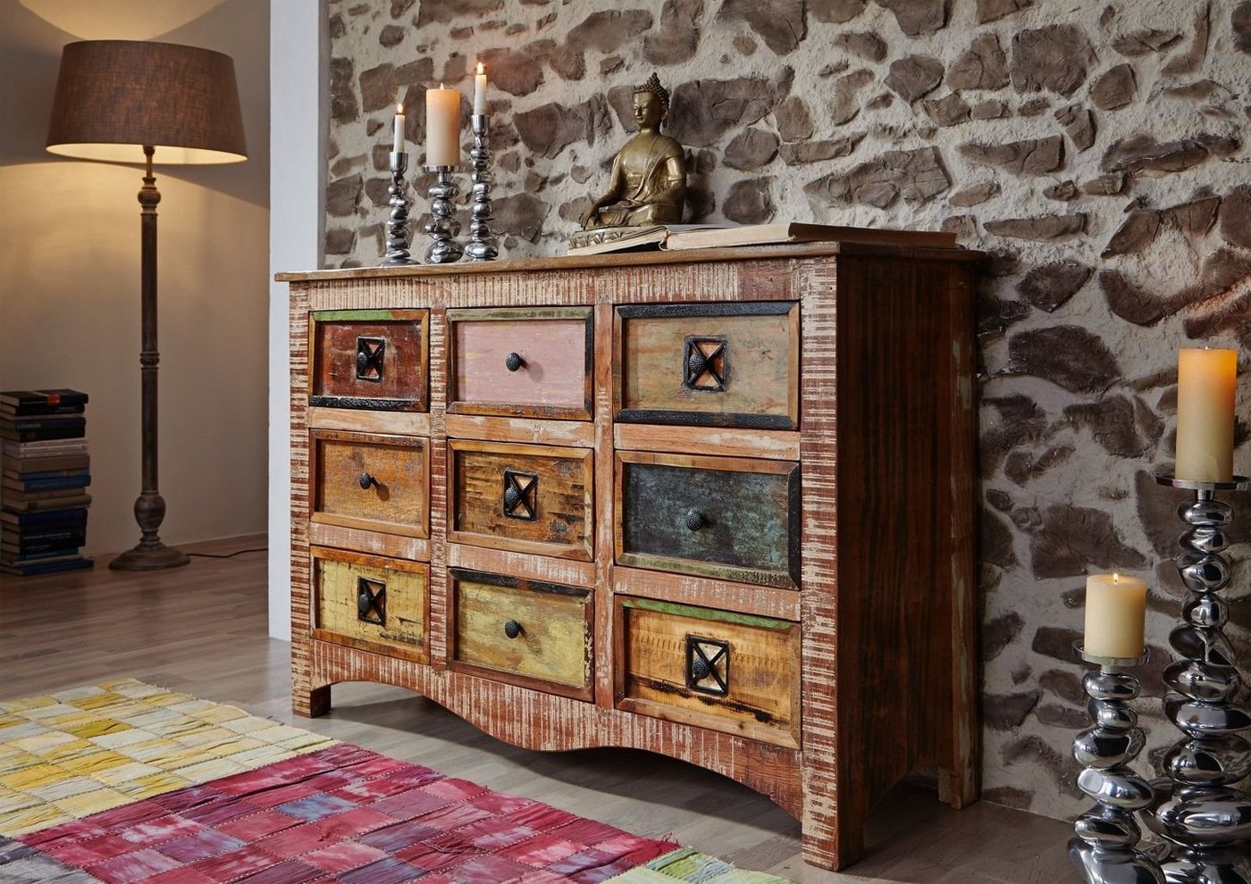Kommode Altholz 130x40x85 mehrfarbig lackiert NATURE OF SPIRIT #59Produkt: Kommode (Vintage) Serie: NATURE OF SPIRIT Breite: 130 cm Tiefe: 40 cm Höhe: 85 cm Gewicht: 74 kg Holzart: Altholz, vollmassiv Material: Massivholz Farbe: mehrfarbig lackiert Versand erfolgt frei Bordsteinkante.Besonderheit: – ca. 60% wiederverwertetes Altholz- Rest, neues massives Mango- oder AkazienholzCharmante Altholz Kommode mit 9 Schubladen im Vintage Stil aus der Serie NATURE OF SPIRIT. Diese Kommode ist im Vintage-Stil gehalten und garantiert so eine ganz besondere Ausstrahlung.Dies wird bei dieser Kommode durch die verschiedenen Farben und Muster der Kommode erreicht.Die Abwechslung der Muster schafft eine Harmonie, die den ganzen Wohnraum ausfüllt und somiteine wohnliche Atmospähre schafft, die Geborgenheit vermittelt.