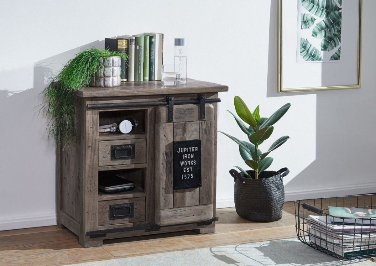 Kommode Mango 70x45x70 grau lackiert RAILWAY #223Produkt: Kommode (Industrial-Stil) Serie: RAILWAY Breite: 70 cm Tiefe: 45 cm Höhe: 70 cm Gewicht: 36 kg Holzart: Mango, vollmassiv Material: Massivholz Farbe: grau lackiert Versand erfolgt frei Bordsteinkante.Nachträglich hinzugefügte wurmähnliche Löcher und Abnutzungsspuren machen diese Holzkommode der RAILWAY Kollektion zum Hingucker in der Wohnung. Das nachbearbeitete Holz des Mangobaums sieht nicht nur effektvoll aus, sondern passt auch gut zu den metallischen Elementen, welche sich im angesagten Industrial-Stil zeigen..
