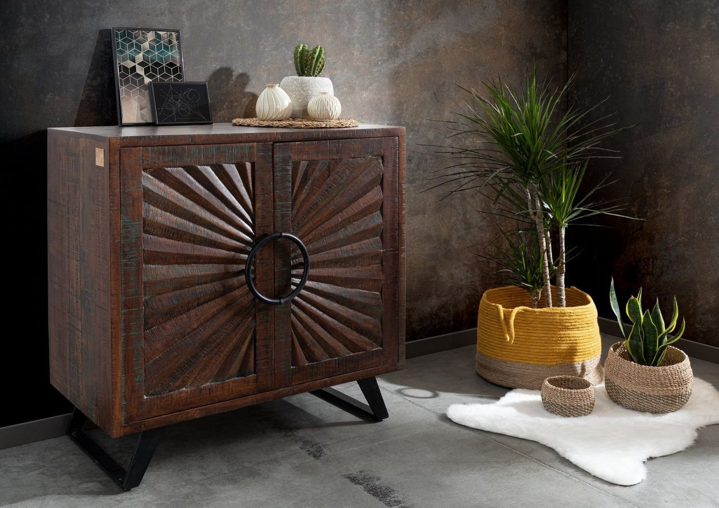 Kommode Akazie 91x46x91 braun lackiert STILMÖBEL #114Produkt: Kommode (Vintage) Serie: STILMÖBEL Breite: 91 cm Tiefe: 46 cm Höhe: 91 cm Gewicht: 60 kg Holzart: Akazie, vollmassiv Material: Massivholz Farbe: braun lackiert Versand erfolgt frei Bordsteinkante.Noble Kommode aus Akazienholz Retro-Feeling vom Feinsten verbreitet diese kleine Kommode aus Massivholz in Ihrem Wohnzimmer. Das Möbelstück ist aus vollmassiver Akazie gefertigt, deren Oberfläche in edlem Braun lackiert ist. Durch die spezielle Auftragetechnik scheint die darunterliegende Farbschicht dezent hervor. Das verleiht der Kommode echten Vintage-Charme. Besonderes Highlight: Die Struktur der Front, die sich sonnenförmig vom runden Metallgriff nach außen hin ausbreitet. Das Holz der Akazie besitzt eine besonders hohe Dichte, die eine enorme Härte des Materials mit sich bringt. Damit ist die schmucke Front gut gegen Abnutzungen aller Art gewappnet. Zur Freude aller Fans von Nachhaltigkeit bleibt die Kommode also nicht nur dem eigenen Wohnzimmer lange erhalten, sondern wird vielleicht sogar einmal zum familiären Erbstück.