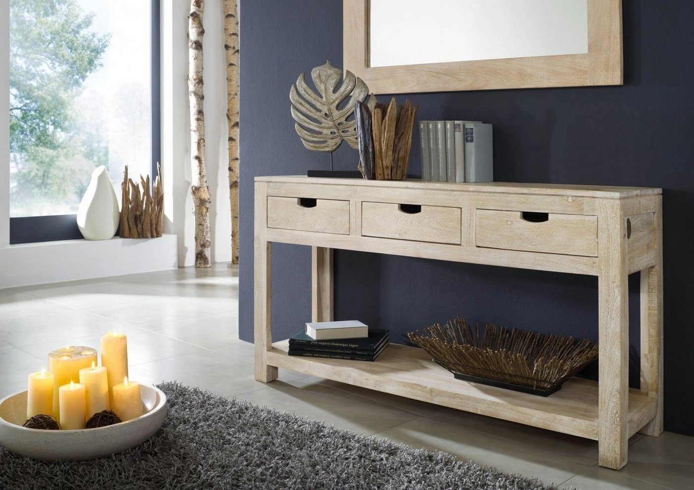 Konsolentisch Akazie 140x40x78 white stone getüncht  NATURE WHITE #90Produkt: Konsolentisch (Modern) Serie: NATURE WHITE Breite: 140 cm Tiefe: 40 cm Höhe: 78 cm Gewicht: 42 kg Holzart: Akazie, vollmassiv Material: Massivholz Farbe: white stone getüncht Versand erfolgt frei Bordsteinkante.Charmanter Hartholz Konsolentisch aus Akazie getüncht der Serie NATURE WHITE. Der Konsolentisch der Möbelserie NATURE WHITE besticht durch seine schönen Farben, die auf Entfernung gekälkt wirkt, aber bei näherer Betrachtung natürlich und unbehandelt aussehen.