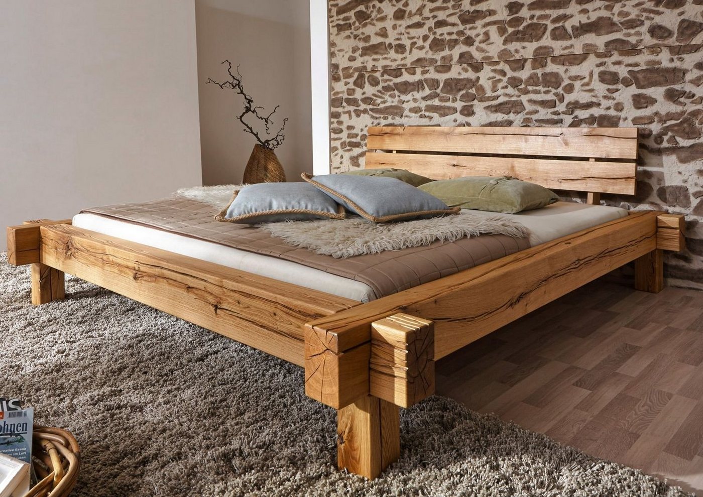 Balkenbett Wildeiche massiv 200x200x85 natur geölt JANGALI #713Produkt: Bett, Bettgestell (Landhausstil) Serie: JANGALI Breite: 238 cm Tiefe: 238 cm Höhe: 85 cm Gewicht: 136 kg Holzart: Wildeiche, vollmassiv Material: Massivholz Farbe: Eiche natur geölt Versand erfolgt frei Bordsteinkante.stylisches Balkenbett in rustikalem Designmassive Fertigung aus Wildeiche Balkenhochwertige Optik und Stabilität durch Zimmermann-Verbindungentoll in Kombination mit anderen Möbeln der BALKENMÖBEL Serie echte vollmassive Balken mit natürlichen RissenBalkenstärke 16×9 cmKopfteil echte BaumkanteEinen Hauch Natur erhalten Sie mit dem Balkenbett aus massiver Wildeiche. Das Bett zeichnet ein moderner und zeitloser Landhausstil aus. Es hat eine geölte Oberfläche.