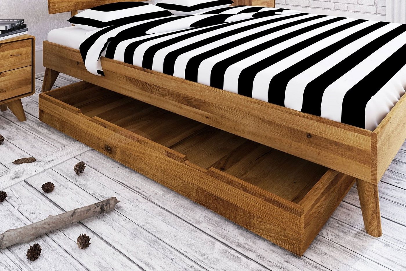 Bettkasten 150x68x15 Wildeiche natur geölt MALMÖ #07Produkt: Schubkasten Serie: MALMÖ Breite: 150 cm Tiefe: 68 cm Höhe: 15 cm Gewicht: 10 kg Holzart: Wildeiche, vollmassiv Material: Massivholz Farbe: Eiche natur geölt Das Produkt wird zerlegt geliefert.- hochwertige Wildeiche aus Mitteleuropa- leichtes Design im modern interpretierten Sixty-Style- moderne eingefräste Griff- zerlegtFür ein Plus an Stauraum unterhalb der Liegefläche sorgt der Bettkasten der Reihe MALMÖ. Dieser nützliche Kasten harmoniert dank seiner Fertigung aus Wildeiche ideal mit den anderen Einrichtungsstücken der Kollektion. Zudem ist der Bettkasten mit allen Betten kompatibel und brilliert mit einem natürlichen Charme, wie ihn nur Massivholz verkörpern kann.