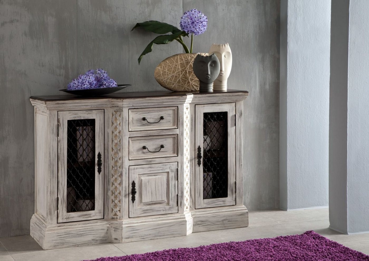 Sideboard Mango / Akazie 135x50x90 weiß gewachst CASTLE-ANTIK #215Produkt: Sideboard Serie: CASTLE-ANTIK Breite: 135 cm Tiefe: 50 cm Höhe: 90 cm Gewicht: 79 kg Holzart: Mango / Akazie, vollmassiv Material: Massivholz Farbe: weiß gewachst Versand erfolgt frei Bordsteinkante.Sideboard aus Vollholz: Romantischer Blickfang Wohnen wie im Schloss? Dieses Sideboard der Wohnserie CASTLE ANTIK macht den Anfang. Denn das vollmassiv aus Mango und Akazie gefertigte Möbelstück bringt eine Menge romantischen Charme mit. So lässt das Finish im Shabby-Chic die Holzoberfläche stellenweise durchblitzen – als hätte es sich im Verlauf der Jahrhunderte abgenutzt. Sockel und Kranz verleihen der Kommode aus Massivholz eine barocke Designsprache, ebenso die Tafeloptik auf den Seitenwänden und der kleinen Türe im Mittelteil. Filigrane Griffe aus schwarzem Metall unterstreichen den antik-romantischen Charakter. Passend dazu sind die Türen der Seiten von einem feinen Gitter verkleidet, das dem Betrachter Einblick ins Innere gewährt. Dieses Gittermuster findet sich auch in den Fräsarbeiten wieder, die den vorspringenden Mittelteil rahmen: Wie feine Zierbordüren zieht sich das Relief hier vertikal entlang der Schrägen.