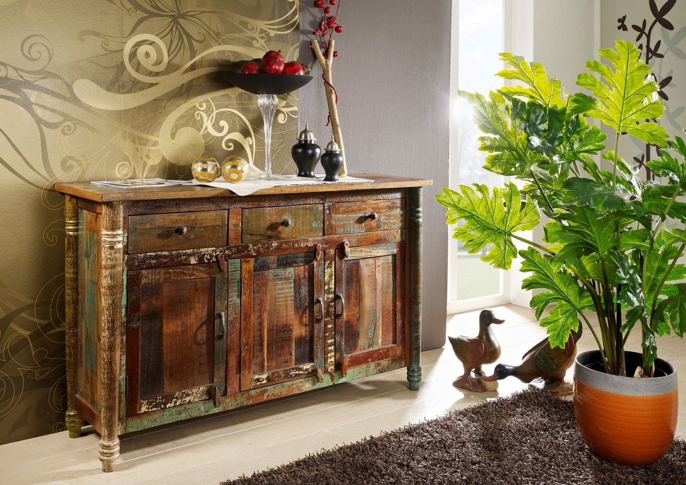 Sideboard Altholz 140x42x88 mehrfarbig lackiert FABLE #04Produkt: Sideboard (Vintage) Serie: FABLE Breite: 140 cm Tiefe: 42 cm Höhe: 88 cm Gewicht: 66 kg Holzart: Altholz, vollmassiv Material: Massivholz Farbe: mehrfarbig lackiert Versand erfolgt frei Bordsteinkante.Besonderheit: – ca. 60% wiederverwertetes Altholz- Rest, neues massives Mango- oder AkazienholzExtravagantes 3-türiges Massivholz Sideboard mit 3 Schubladen im Vintage-Stil aus der Serie FABLE, Altholz lackiert.Dieses nostalgische Sideboard in einem Wohnraum platziert kann den Grundstein für eine komplette Einrichtung im Vintage Stil darstellen. Die betont bunte Oberfläche des indischen Altholzes erscheint ausgewogen und bietet die unbegrenzte Kombinationsmöglichkeit mit jedem anderen Möbelstück. Ebenso stellt die vollmassive Verarbeitung die Hochwertigkeit dieses kostbaren Möbels eindrucksvoll in den Vordergrundund vereint ausdrucksstark sowohl Qualität als auch die schmückende Optik.