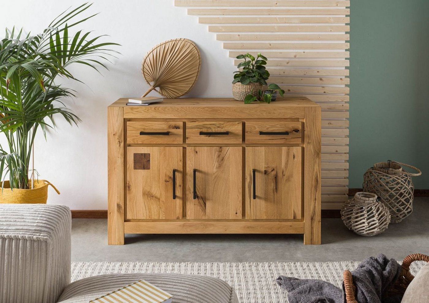 Sideboard Wildeiche 130x45x85 natur geölt GLASGOW #001Produkt: Sideboard (modern) Serie: GLASGOW Breite: 130 cm Tiefe: 45 cm Höhe: 85 cm Gewicht: 85 kg Holzart: Wildeiche, vollmassiv Material: Massivholz Farbe: Eiche natur geölt Versand erfolgt frei Bordsteinkante.Hinter drei Türen und in drei Schubladen hält dieses Sideboard aus Wildeiche viel Stauraum im Wohn- und Essbereich bereit. Das Möbelstück, das aus massivem Eichenholz gearbeitet ist, wurde lediglich mit wertigen Ölen behandelt. So bleibt nicht nur die offenporige Struktur des Holzes erhalten, auch die lebendige Maserung und die sichtbaren Astansätze werden zusätzlich betont. Dank der klassischen Formsprache fügt sich das Sideboard als zeitloses Massivholzmöbel in jede Wohnumgebung ein.