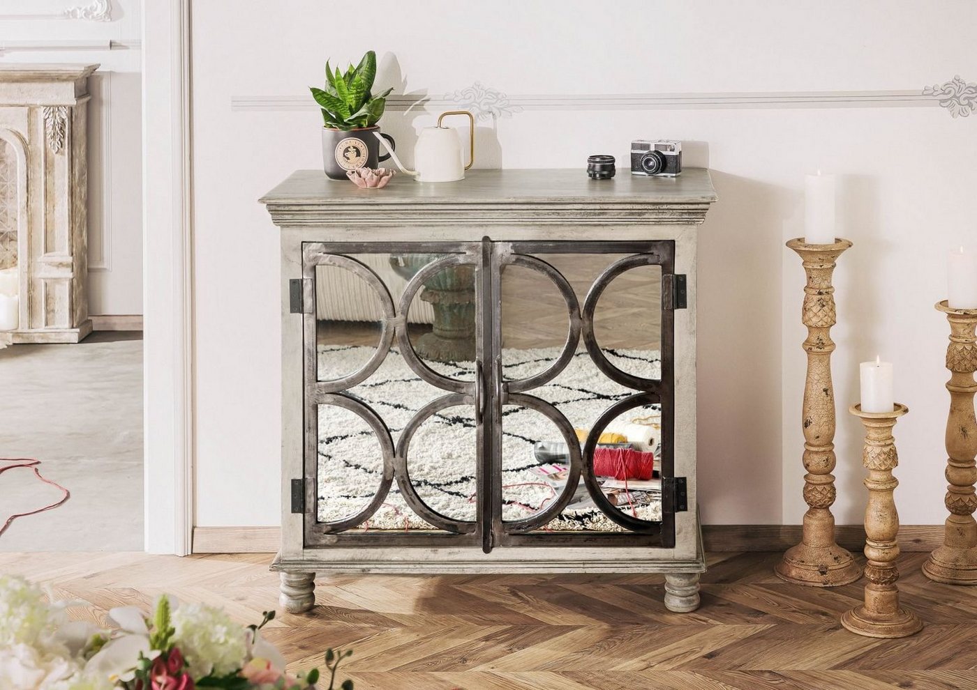 Sideboard Mango 97x45x92 grau lackiert HERMITAGE #013Produkt: Sideboard (Landhausstil) Serie: HERMITAGE Breite: 97 cm Tiefe: 45 cm Höhe: 92 cm Gewicht: 47 kg Holzart: Mango, vollmassiv Material: Eisen Farbe: grau lackiert Versand erfolgt frei Bordsteinkante.Art déco trifft Landhaus-Romantik: Dieses Sideboard aus massivem Mangoholz, Glas und Eisendekor lenkt die Blicke auf sich. Die rundlichen Formen des dunklen Eisens ziehen sich in echter Vintage-Manier über die Spiegelfläche. Möbelkränze und Kugelfüße bringen hingegen Landhausstil ins Spiel. Praktische Magnetverschlüsse halten die Türen in Position.