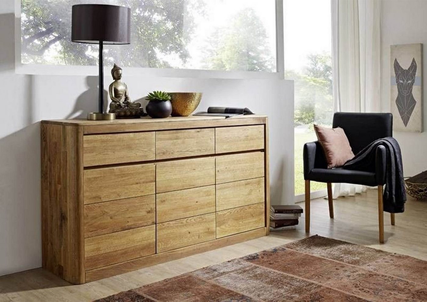Sideboard Wildeiche 160x40x88 natur geölt LINZ #100 —Produkt: Sideboard (Modern) Serie: LINZ Breite: 160 cm Tiefe: 40 cm Höhe: 88 cm Gewicht: 72 kg Holzart: Wildeiche, vollmassiv Material: Massivholz Farbe: Eiche natur geölt Versand erfolgt frei Bordsteinkante.Dieses Sideboard der Reihe LINZ wirkt aufgrund der intensiven Zeichnung des Holzes besonders ansprechend. Toll ins Bild passt auch die dreigliedrige Optik, die jeweils aus Schublade und Türe besteht. Über die Front der Kommode zieht sich die beeindruckende braune Maserung, die für einen wunderschön natürlichen Look in Ihrem Zuhause sorgt!
