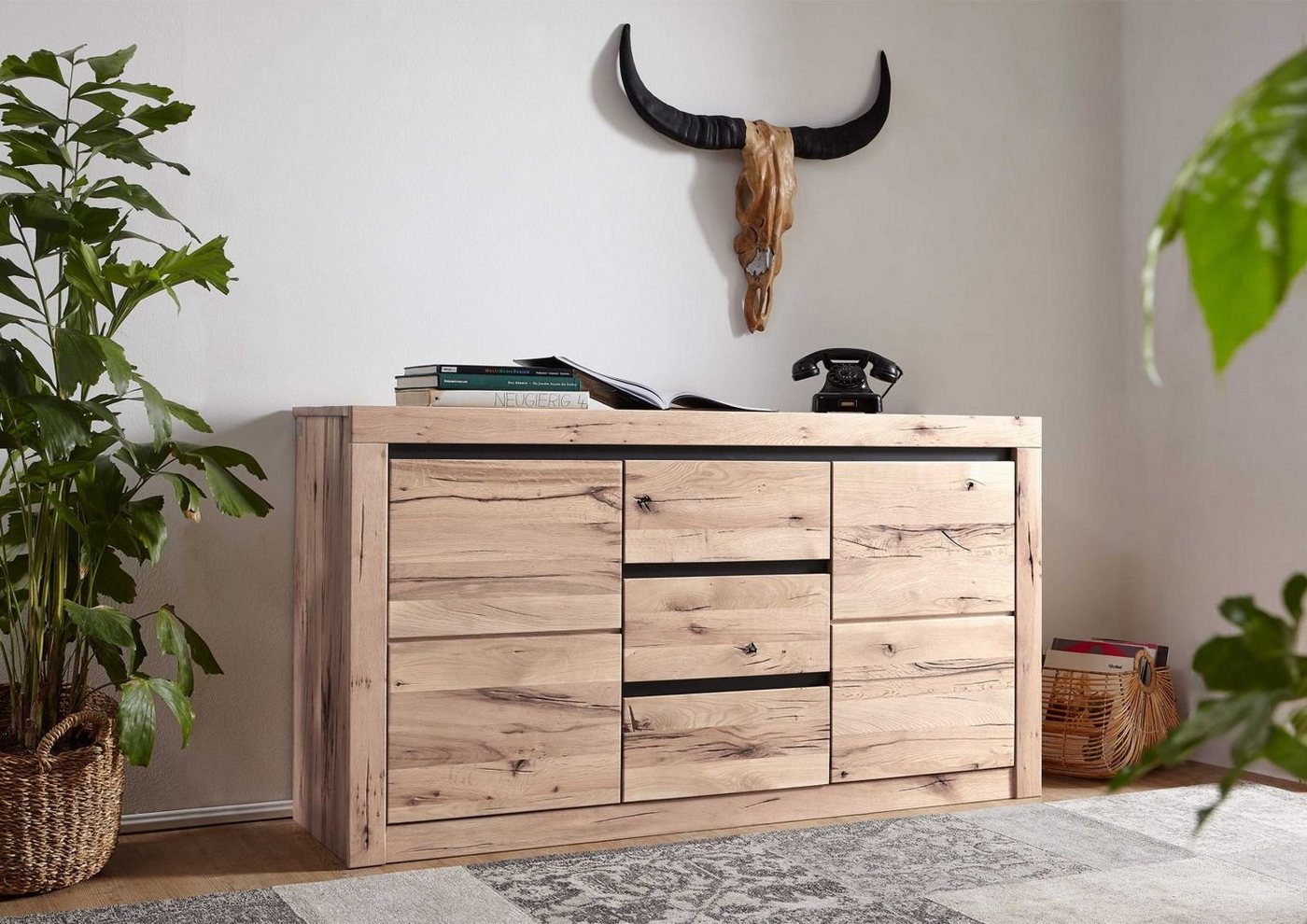 Sideboard Zerreiche 155x45x85 bianco geölt MONTREUX #227Produkt: Sideboard (Modern) Serie: MONTREUX Breite: 155 cm Tiefe: 45 cm Höhe: 85 cm Gewicht: 89 kg Holzart: Wildeiche / Zerreiche, vollmassiv Material: Massivholz Farbe: bianco geölt Versand erfolgt frei Bordsteinkante.- Holz-Mix aus Wild- und urwüchsiger Zerreiche- Soft-Close-System für Türen und Schubladen- auffälliges Farbspiel (hell über rötlich bis dunkel bzw. schwarz)- puristisches griffloses Design- starke Riss-Optik- erhältlich in 3 Farbe, Natur, Bianco (hell) Tabacco (dunkelbraun)- Möbel sind aufgebaut, bei Tischen müssen Beine montiert werden- unaufgeregte dunkle Metallblende