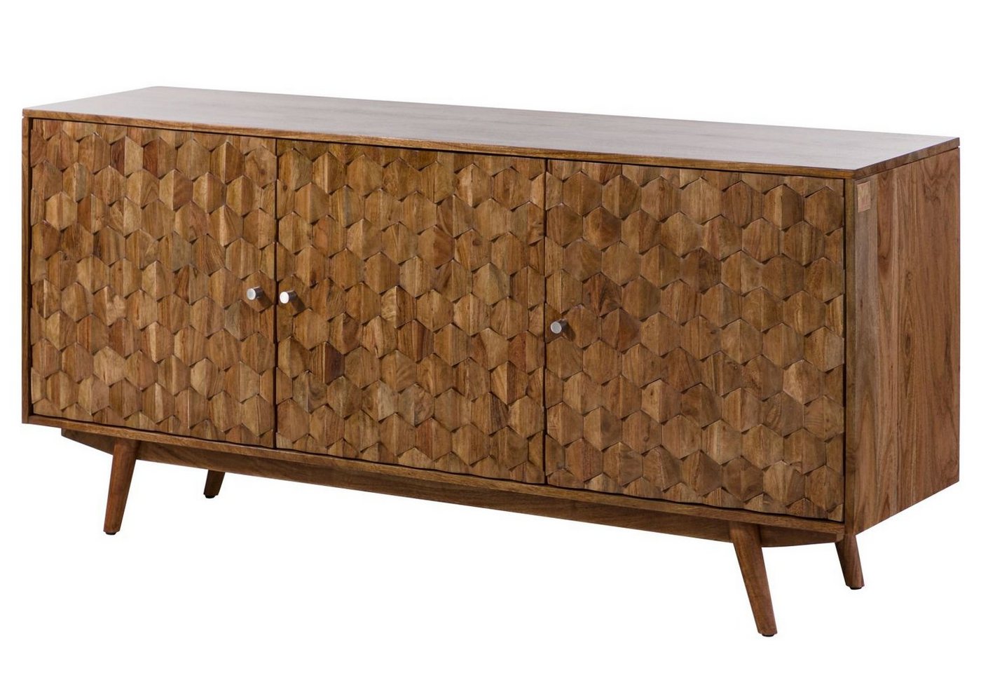 Sideboard Akazie 160x42x75 Akazie natur lackiert MOSAYK #110So simpel €“ so raffiniert: Diese Kommode der Einrichtungsserie MOSAYK braucht nicht viel, um zu überzeugen. Der stabile Korpus besteht aus vollmassiver Akazie und wurde für ein glänzendes Finish natur lackiert. Die komplette Front ist von einem Wabenmuster überzogen, dessen Struktur ein interessantes Spiel mit Licht und Schatten hervorruft €“ ein echter Blickfang, der jedes Wohnzimmer aufwertet. Das Muster ziert drei Türfronten, hinter denen sich auf je zwei Ebenen Stauraum für alle möglichen Gegenstände des Alltags verbirgt. Die geradlinige Formgebung, die feinen Metallgriffe und die nach außen weisenden Holzfüße erinnern indes stark an das ikonische Möbeldesign der 60er Jahre.