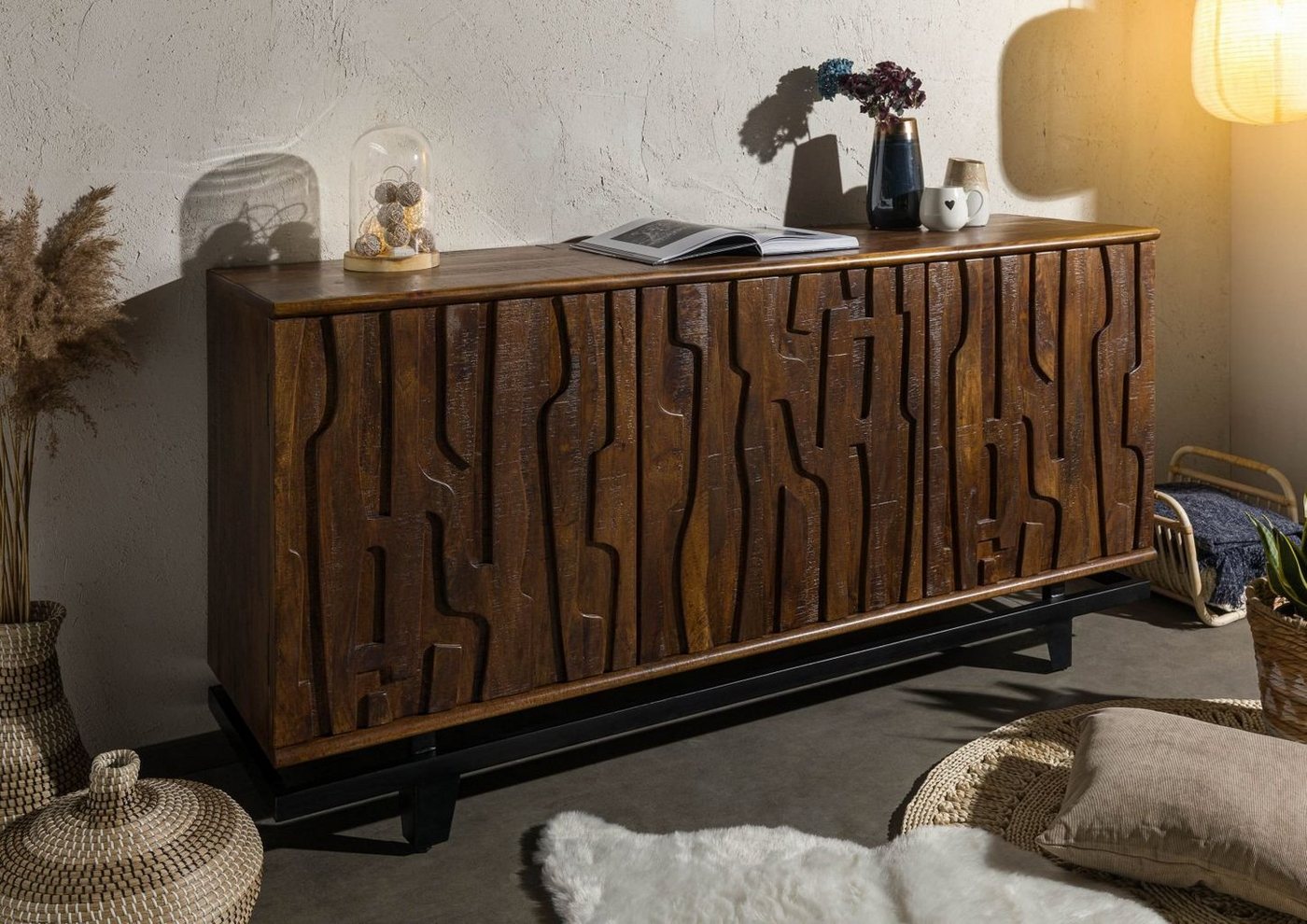 Sideboard Mango 183x47x89 braun lackiert STILMÖBEL #127Produkt: Sideboard (Vintage) Serie: STILMÖBEL Breite: 183 cm Tiefe: 47 cm Höhe: 89 cm Gewicht: 94 kg Holzart: Mango, vollmassiv Material: Massivholz Farbe: braun lackiert Versand erfolgt frei Bordsteinkante.Diese Kommode der STILMÖBEL Serie ist aus massivem Mangoholz gearbeitet. Unter lackierten Oberfläche kommt das natürliche Holzbild toll zur Geltung. Das optische Highlight der Kommode stellen jedoch die dreidimensionalen Fronten dar: Organische Strukturen und Vertiefungen zieren die drei Türen des Möbelstücks. Ein schwarzes Metallgestell komplettiert das moderne Äußere dieses Designer-Sideboards.