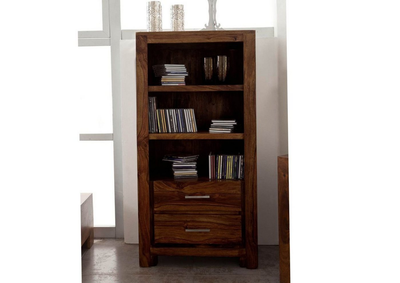 Regal Sheesham 60x35x120 life honey lackiert METRO LIFE #112Produkt: Regal (Modern) Serie: METRO LIFE Breite: 60 cm Tiefe: 35 cm Höhe: 120 cm Gewicht: 35 kg Holzart: Sheesham / Palisander, vollmassiv Material: Massivholz Farbe: life honey lackiert Versand erfolgt frei Bordsteinkante.Modernes Edelholz Regal mit 2 Schubladen und 3 Ablagefächern aus unserer Serie METRO LIFE.