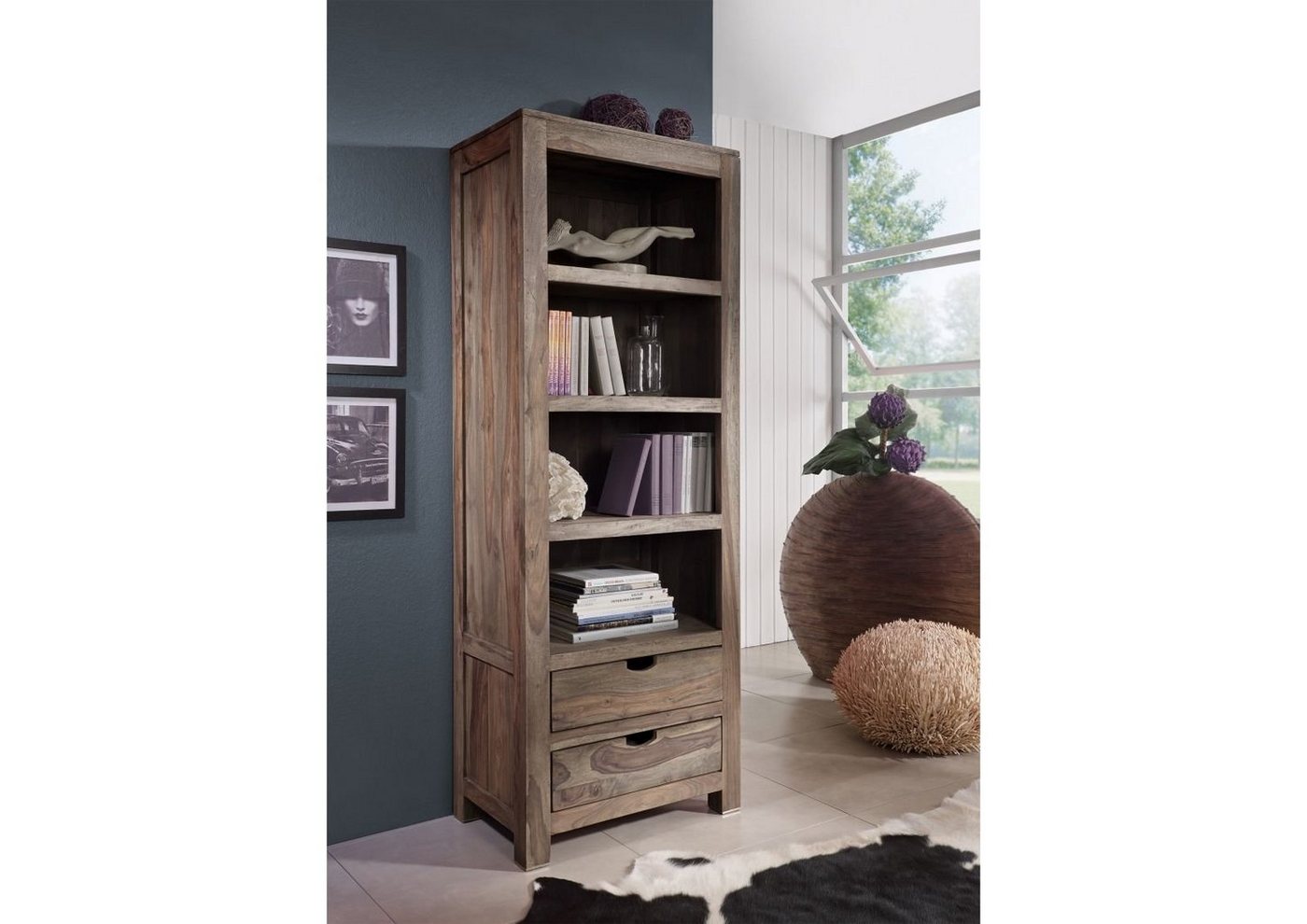 Regal Sheesham 65x42x180  grau geölt NATURE GREY #50Produkt: Regal (Modern) Serie: NATURE GREY Breite: 65 cm Tiefe: 42 cm Höhe: 180 cm Gewicht: 65 kg Holzart: Sheesham / Palisander, vollmassiv Material: Massivholz Farbe: grau geölt Versand erfolgt frei Bordsteinkante.Modernes Edelholz Regal mit 4 Ablagefächern und 2 Schubladen aus unserer Serie NATURE GREY aus Sheesham/Palisander geölt.Egal für welchen Wohnbereich Sie dieses Regal erwerben möchten, es macht dank seiner praktischen und variablen Aufteilung überall eine gute Figur.Das Sheeshamholz besticht bei diesem ungewöhnlichem Regal durch die bunten Wellenmuster im Holz. Jedes Holz hat seine ganz eigenen Maserung und ist ein Unikat. Insgesamt ist dieses Regal sehr vielseitig einsetzbar und äußerst kombinationsfreudig.