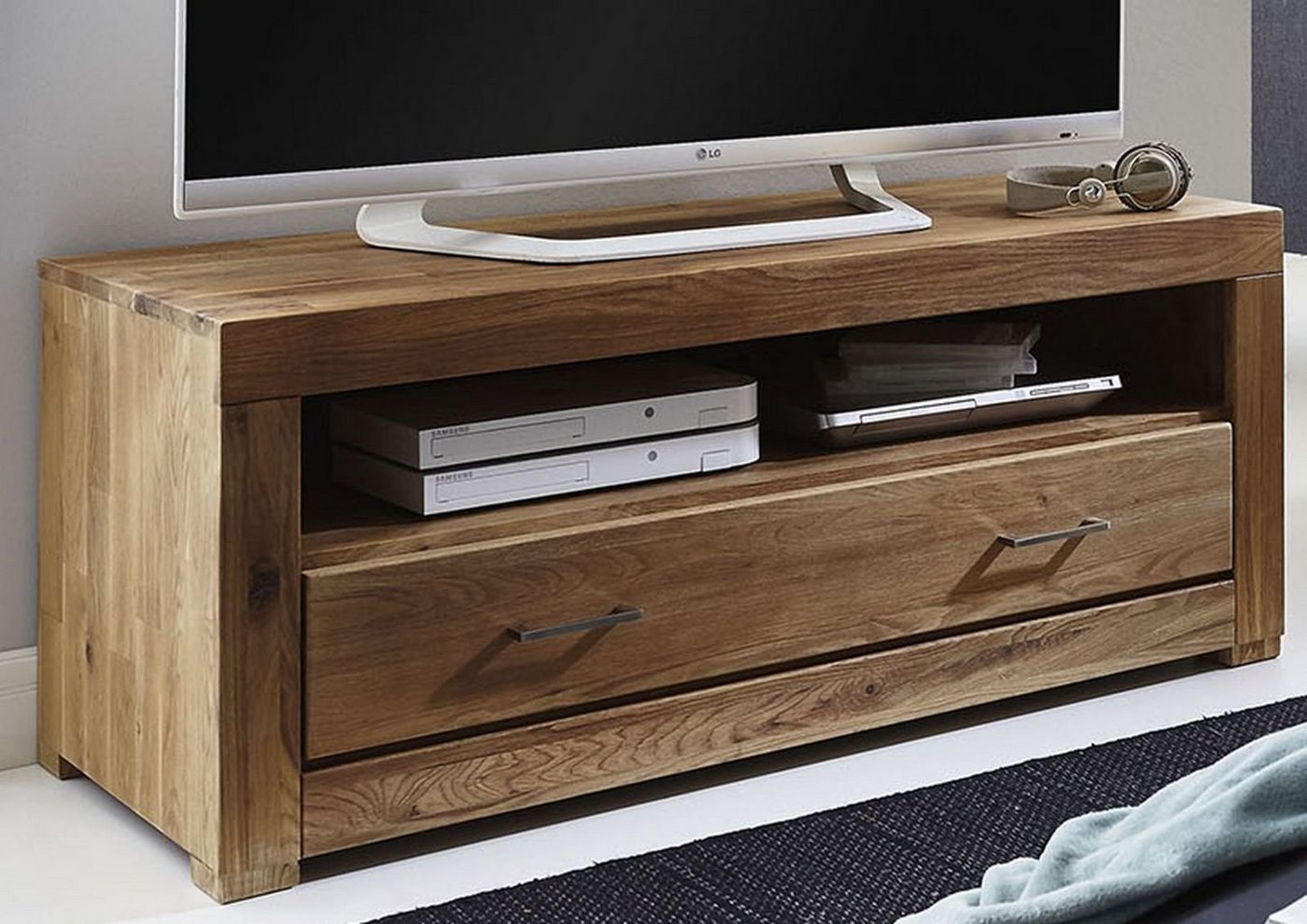 TV-Board Wildeiche 115x48x63 natur geölt BERLIN #20Produkt: TV-Board (Modern) Serie: BERLIN Breite: 115 cm Tiefe: 48 cm Höhe: 63 cm Gewicht: 46 kg Holzart: Wildeiche, vollmassiv Material: Massivholz Farbe: Eiche natur geölt Versand erfolgt frei Bordsteinkante.Klein, kompakt und ein wunderbares Wohnaccessoire für Ihr technisches Equipment. Sie haben hier ausreichend Platz für das Abstellen eines TV-Gerätes. In das offene Schubfach passt ein Receiver oder ein DVD-Player. Im unteren Schubfach haben Sie endlich Platz für alles Herumliegende wie Kabel und Fernbedienungen. Dank des schlichten Designs fügt sich dieses TV-Board in jede bestehende Einrichtung.