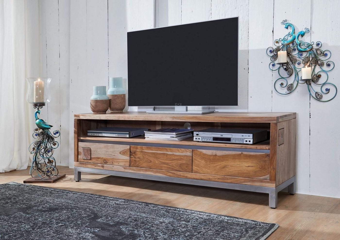 TV-Board Sheesham / Akazie 170x40x56 braun gebeizt LE HAVRE #15Produkt: TV-Board (Modern) Serie: LE HAVRE Breite: 170 cm Tiefe: 40 cm Höhe: 56 cm Gewicht: 54 kg Holzart: Sheesham / Akazie, vollmassiv Material: Massivholz Farbe: braun gebeizt Versand erfolgt frei Bordsteinkante.- neue exclusive Sheesham Farbe- Hirnholz-Element- Oberfläche lackiert- moderne Metall/Holz Kombination- Griffleisten mit Metall hinterlegt- Türen mit Topfbandscharnier- Schubladen mit Teleskopauszug – Hochwertige Metallrahmen Konstruktion inkl. Füße- Möbel sind aufgebaut /Tische und Bänke müssen Beine montiert werden- Nur exklusiv bei uns erhältlich – Ablagefach- 3 SchubladenEinen unikaten Charakter bekommt dieses TV-Board durch das Hirnholz-Element, das in die Schublade eingearbeitet ist. Doch auch das interessante Holzbild macht das TV-Rack der Reihe LE HAVRE zum Blickfang. Gefertigt aus Sheesham und in einer exklusiven Farbnuance begeistert das Einrichtungsstück mit einem luxuriösen Äußeren, bei dem auch die Funktion nicht zu kurz kommt. In drei Schubladen ist nämlich viel Stauraum für Ihr TV-Equipment.