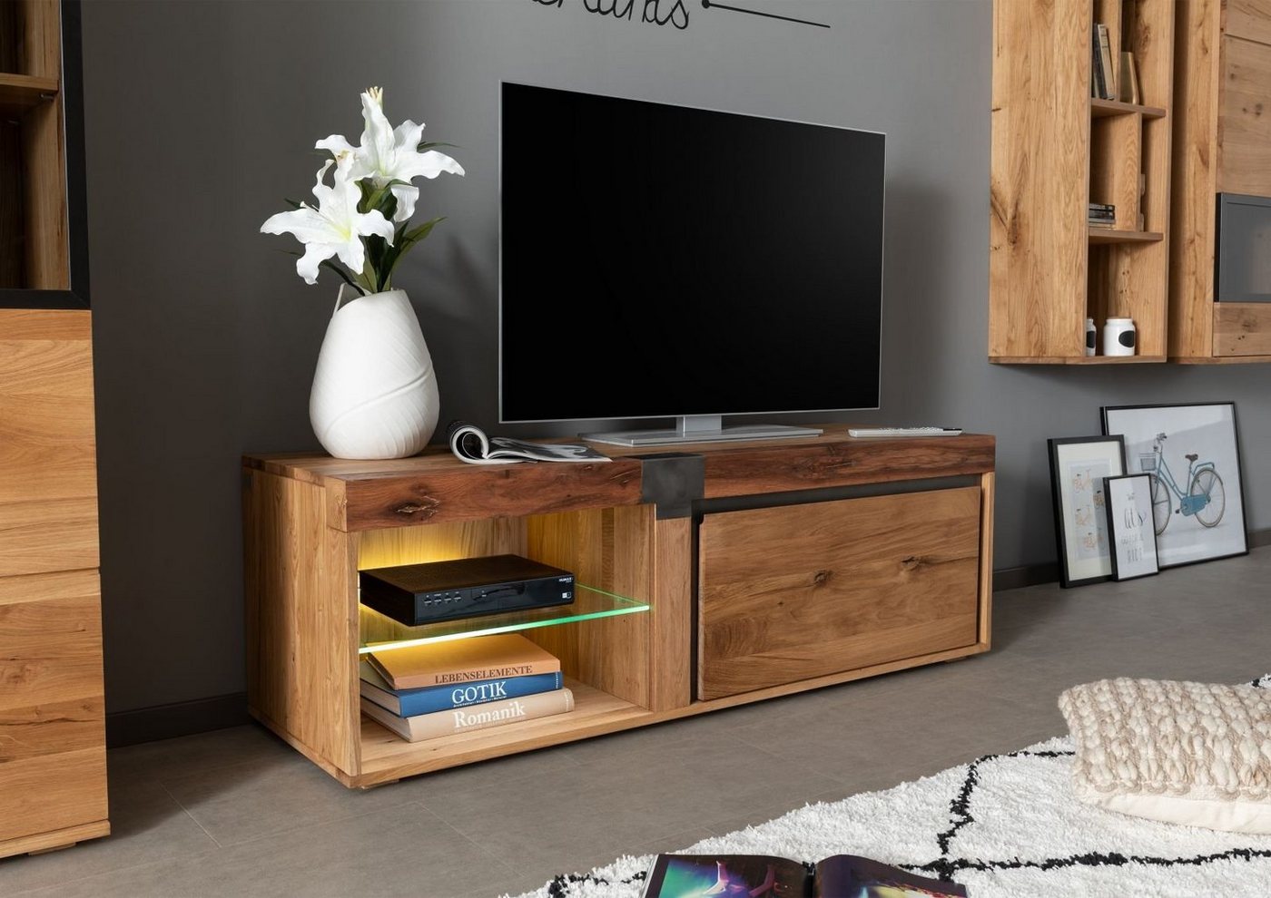 TV-Board Wildeiche / Zerreiche 150x48x50 natur geölt NEW AMSTERDAM #01Produkt: TV-Board (Modern) Serie: NEW AMSTERDAM Breite: 150 cm Tiefe: 48 cm Höhe: 50 cm Gewicht: 70 kg Holzart: Wildeiche / Zerreiche, vollmassiv Material: Massivholz Farbe: Eiche natur geölt Versand erfolgt frei Bordsteinkante. TV-Board aus Eiche: Industrielle Akzente Dieses TV-Board aus Zerr- und Wildeiche der Serie NEW AMSTERDAM bringt den industriellen Stil ganz dezent in Ihr Wohnzimmer. Der edle Holzmix steht im spannenden Kontrast zu den leichten Glasboden und dem zentral gesetzten Metallelement. Gemeinsam mit dem geradlinigen Design aus der Feder von Erik Quicker unterstreicht dies das industrielle Flair des TV-Lowboards aus Massivholz. Besonderer Eyecatcher: Der solide Holzbalken, der den Blick auf den oberen Abschluss des Möbels lenkt.