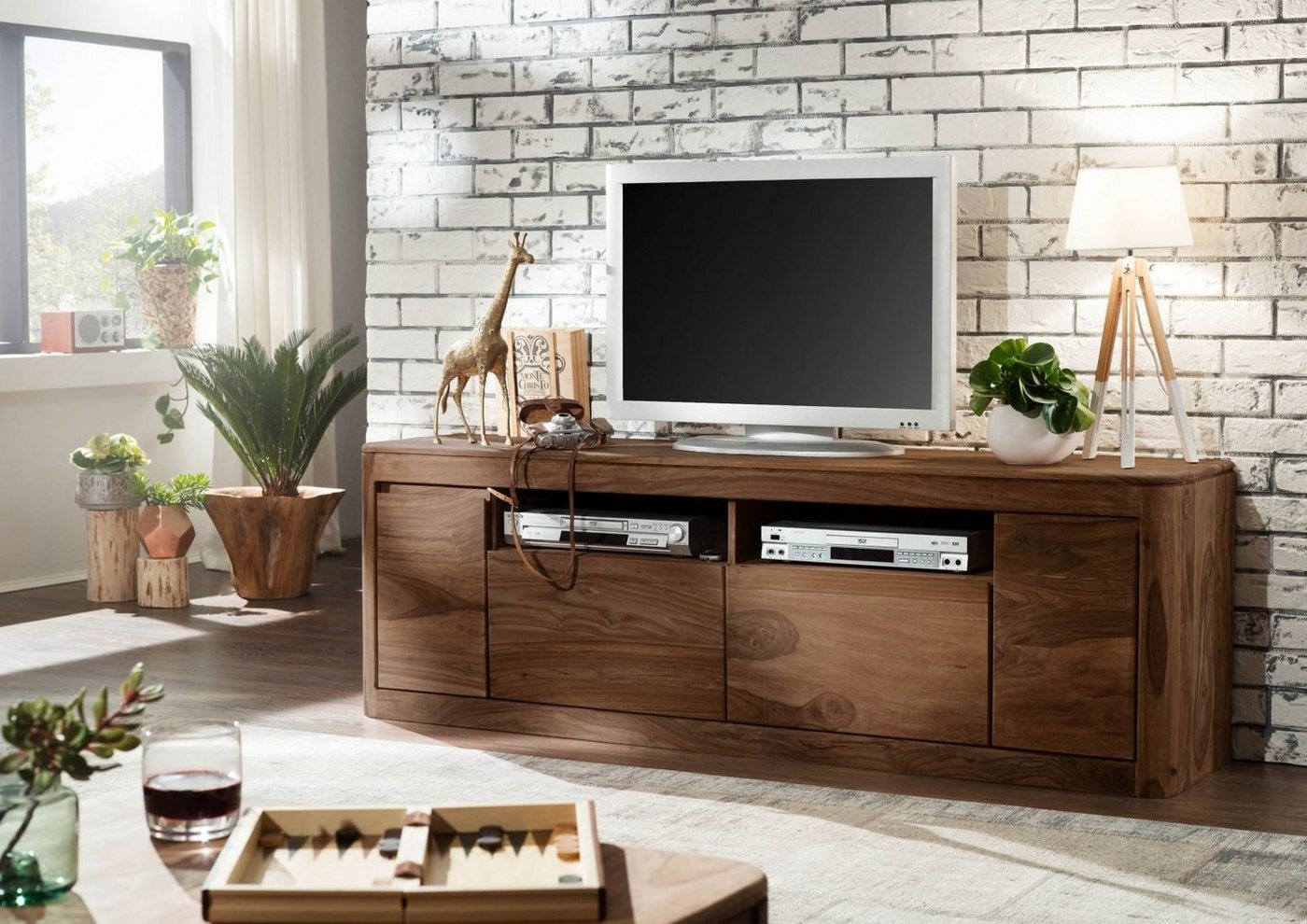 TV-Board Sheesham 178x40x58 smoked cherry gebeizt TORONTO #121Produkt: Sideboard (Modern) Serie: TORONTO Breite: 178 cm Tiefe: 40 cm Höhe: 58 cm Gewicht: 74 kg Holzart: Sheesham / Akazie, vollmassiv Material: Massivholz Farbe: smoked cherry gebeizt Versand erfolgt frei Bordsteinkante.Nehmen Sie sich einen Moment Zeit für die Betrachtung dieses Massivholzmöbels und finden Sie in Gedanken schon einmal einen schönen Platz dafür.Mit seinen beiden offenen Fächern ist das Sideboard das ideale TV Möbel. Sie können darauf einen Fernseher platzieren und haben rundherum Platz und Stauraum für das technische Zubehör, aber auch Decken, Kissen oder Essgeschirr. Passend zu unserer gesamten TORONTO Möbelkollektion hat auch dieses TV Board abgerundete Ecken und ist aus dem sehr massiven Holz des Palisanders gearbeitet. Die intensive Maserung des Holzes wurde durch eine Beize in smoked cherry noch einmal unterstrichen.