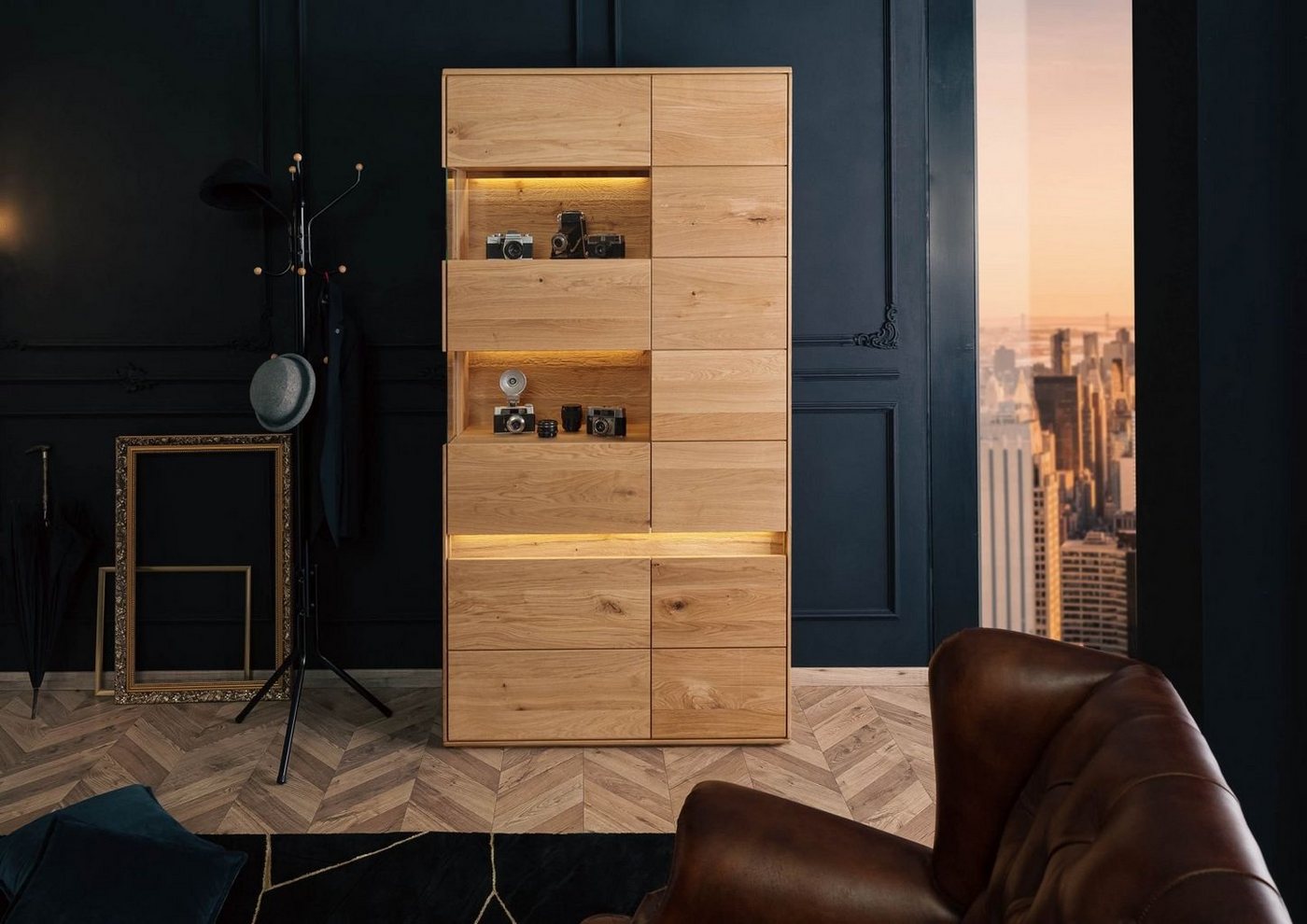 Vitrine Wildeiche inkl. LED 103×43,5×207 natur geölt CARDIFF #111Produkt: Vitrine (Modern) Serie: CARDIFF Breite: 103 cm Tiefe: 43,5 cm Höhe: 207 cm Gewicht: 117 kg Holzart: Wildeiche, vollmassiv Material: Massivholz Farbe: Eiche natur geölt Das Produkt wird montiert geliefert. Versand erfolgt frei Bordsteinkante. Benötigen Sie weitere Versandinformationen, können Sie uns gerne telefonisch erreichen! beleuchtete und grifflose Eiche Vitrine, massiv gearbeitetviel Stauraum hinter 4 Türen: unten Holztüren, oben links Tür mit Glaseinsätzengetäfelte Optik unterstreicht die Eleganz der grifflosen FrontenDesigndetails: abgerundete Kanten und die gebürstete BlendeJetzt weitere Massivholzmöbel der Serie CARDIFF entdecken!Blickfang Holz: Diese Vitrine der Serie CARDIFF ist ein echter Eyecatcher. Gefertigt aus massivem Eichenholz überzeugt das Möbelstück mit einer naturnahen Ausstrahlung. Glaseinsätze in den Türen lassen Raum für Kreativität: Platzieren Sie hier all Ihre Sammler- und Schaustücke. Die beleuchtete Zierleiste rundet das gelungene Äußere des Vitrinenschranks ab und lenkt den Blick auf das gebürstete Holz, mit dem die Griffmulden hinterlegt sind. Ein Möbelstück aus Massivholz mit raffinierten Details!