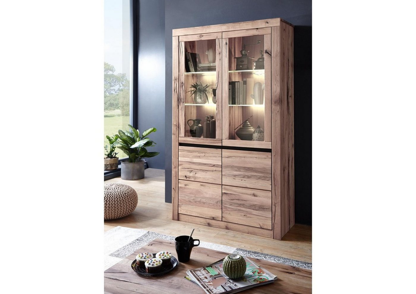 Vitrine Zerreiche 105x42x190 bianco geölt MONTREUX #201Produkt: Vitrine (Modern) Serie: MONTREUX Breite: 105 cm Tiefe: 42 cm Höhe: 190 cm Gewicht: 107 kg Holzart: Wildeiche / Zerreiche, vollmassiv Material: Massivholz Farbe: bianco geölt Versand erfolgt frei Bordsteinkante.- Holz-Mix aus Wild- und urwüchsiger Zerreiche- Soft-Close-System für Türen und Schubladen- auffälliges Farbspiel (hell über rötlich bis dunkel bzw. schwarz) – puristisches griffloses Design- starke Riss-Optik- erhältlich in 3 Farben: Natur, Bianco (hell), Tabacco (dunkelbraun)- Möbel sind aufgebaut, bei Tischen müssen Beine montiert werden- optional: Glasbodenbeleuchtung- unaufgeregte dunkle MetallblendeDiese Vitrine der MONTREUX Linie fällt durch ihr interessantes Holzbild auf, das sowohl die Holztüren als auch den gesamten Korpus des Möbelstücks ziert. Ein breites Farbspektrum und tiefe Risse prägen den Holz-Mix aus Zerreiche und Zerreiche. Die modernen Designelemente der Vitrine aus Massivholz stellen die dunkel hervorstechende Metallleiste und die beiden grifflosen Glastüren dar.