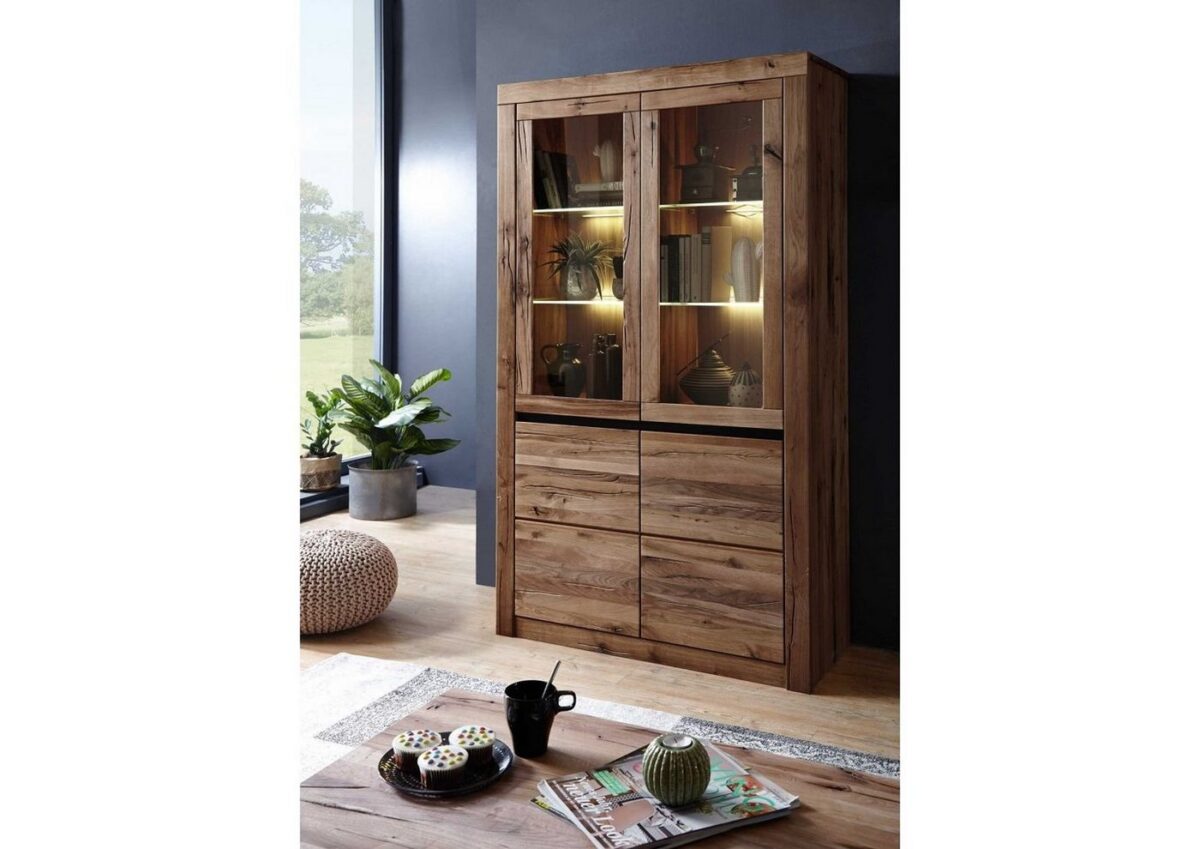 Vitrine Zerreiche 105x42x190 Tabacco brown geölt MONTREUX #301Produkt: Vitrine (Modern) Serie: MONTREUX Breite: 105 cm Tiefe: 42 cm Höhe: 190 cm Gewicht: 107 kg Holzart: Wildeiche / Zerreiche, vollmassiv Material: Massivholz Farbe: tabacco brown geölt Versand erfolgt frei Bordsteinkante.- Holz-Mix aus Wild- und urwüchsiger Zerreiche- Soft-Close-System für Türen und Schubladen- auffälliges Farbspiel (hell über rötlich bis dunkel bzw. schwarz) – puristisches griffloses Design- starke Riss-Optik- erhältlich in 3 Farben: Natur, Bianco (hell), Tabacco (dunkelbraun)- Möbel sind aufgebaut, bei Tischen müssen Beine montiert werden- optional: Glasbodenbeleuchtung- unaufgeregte dunkle MetallblendeGerade im Wohn- und Essbereich ist diese Vitrine der Reihe MONTREUX perfekt aufgehoben. Das Möbelstück wurde aus solider Wildeiche und langlebiger Zerreiche gefertigt und tut sich durch seine erstklassige Qualität hervor. Auch das rissige und intensiv gemaserte Holzbild verdient einen genaueren Blick. Den modernen Gegenpart stellen die Glas- und Metallelemente dar, die das Holz kennzeichnen.