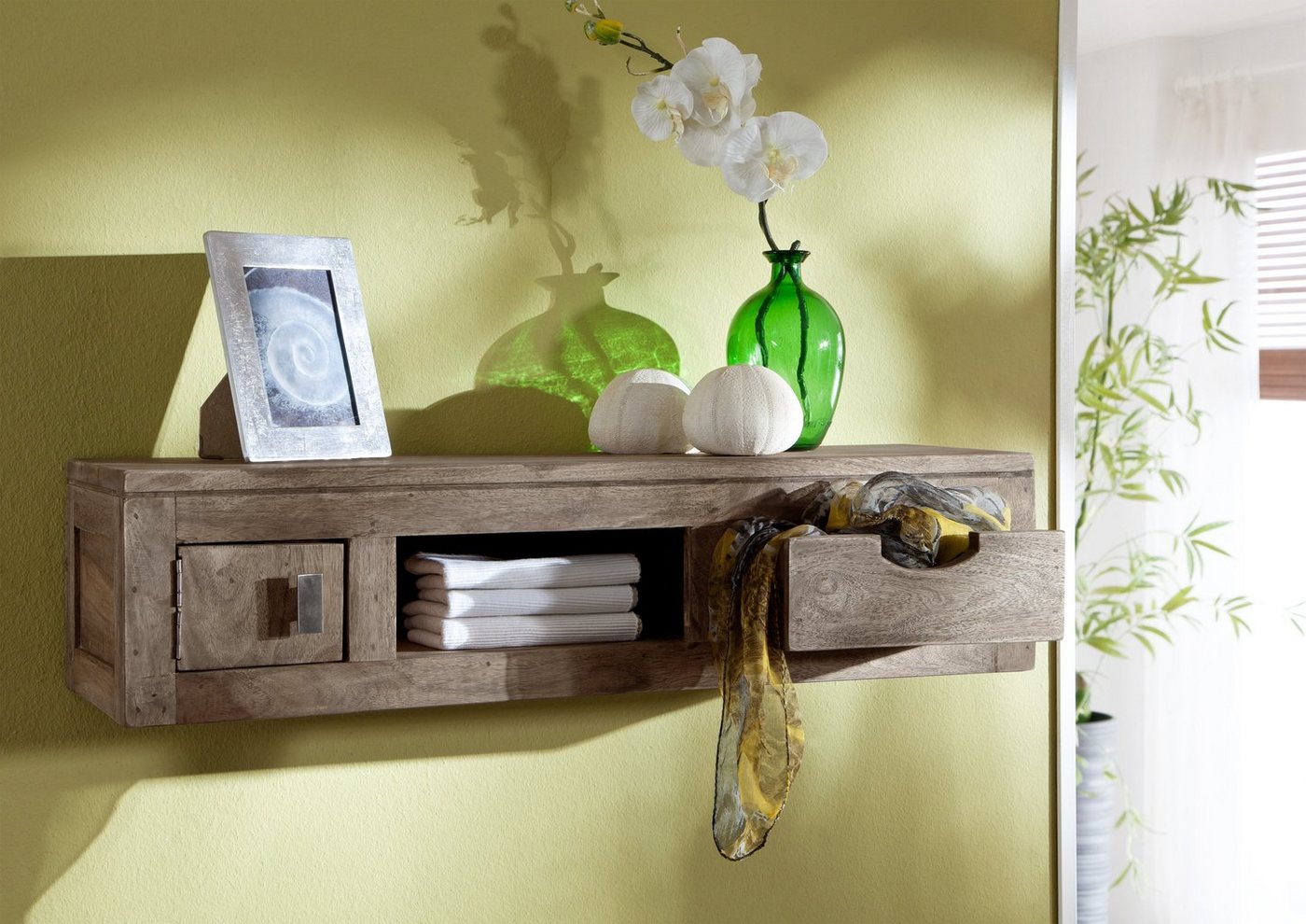 Wandelement Sheesham 84x25x20  grau geölt NATURE GREY #060Produkt: Regal Serie: NATURE GREY Breite: 84 cm Tiefe: 25 cm Höhe: 20 cm Gewicht: 9 kg Holzart: Sheesham / Palisander, vollmassiv Material: Massivholz Farbe: grau geölt Das Produkt wird montiert geliefert.Wunderschönes Wandelement aus der Serie Nature Grey mit einer Tür, einer Schublade und einem Fach.Wandelemente sind mittlerweile eine sehr schöne Alternative zu Bildern und Wanddekoration und bieten gleichzeitig noch Stauraum für allerlei im Haushalt anfallenden Kleinigkeiten. Die besondere Maserung und Struktur des Sheesham/Palisanderholzes, die so kein zweites Mal wieder auftritt, wird durch die Behandlung des Splintholzes mit Öl besonders hervorgehoben.