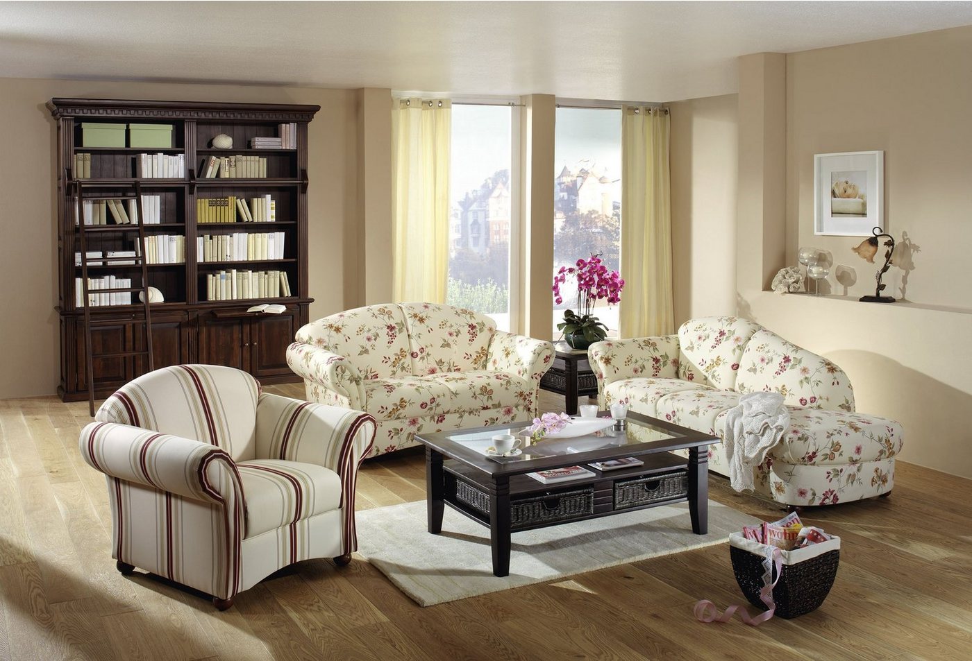 Sessel geblümtVollpolstersessel mit Chatosenseitenteil im Landhausstil. Romantisch verspielt gibt dieser wunderschöne Sessel Ihrem Raum eine besondere Note. Das florale Muster unterstreicht den wohnlichen Akzent. Die dunklen Buchefüße runden das Gesamtbild ab. Schön als Einzelstück oder in Verbindung mit der passenden Garnitur. Die Füße sind zur einfachen Selbstmontage.Scheuertouren: &gt, 24.000Pilling: 4Lichtechtheit: 5Reibechtheit (trocken): 4 – 5Reibechtheit (nass): 4 – 5