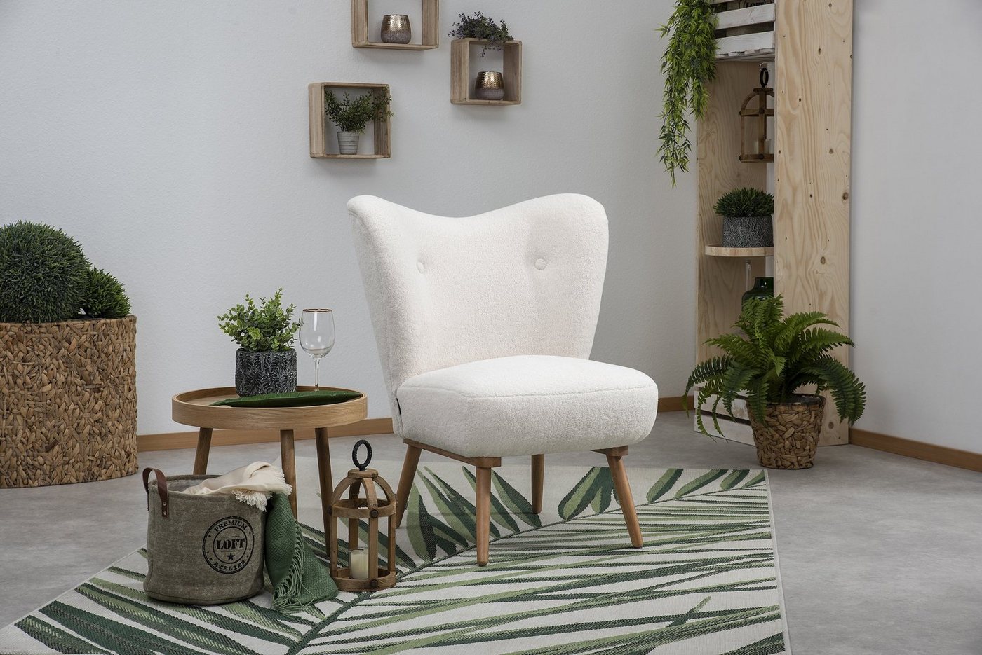 Sessel PlüschstoffEleganter Cocktailsessel im Retro-Look. Die aufwendige handwerkliche Verarbeitung zeigt sich durch formschöne Nähte und zwei Zierknöpfe im Rücken. Die Rückenpartie folgt einer eleganten Linienführung und macht Jack zum Blickfang für jeden Raum. Ein besonderer Blickfang ist der lateinamerikanisch inspirierte Stoffbezug in blau-weiß mit ornamentalen Blüten- und Vogelmotiven im Allover-Print. Der dekorative Unterbau aus massiven Holzleisten und die Massivholzfüße aus Buche erlefarbig lackiert runden den Look ab und machen Jack zu einem echten Eye-Catcher.Scheuertouren: &gt, 50.000Pilling: 4 – 5Lichtechtheit: &gt, 5Reibechtheit (trocken): 4 – 5Reibechtheit (nass): 4